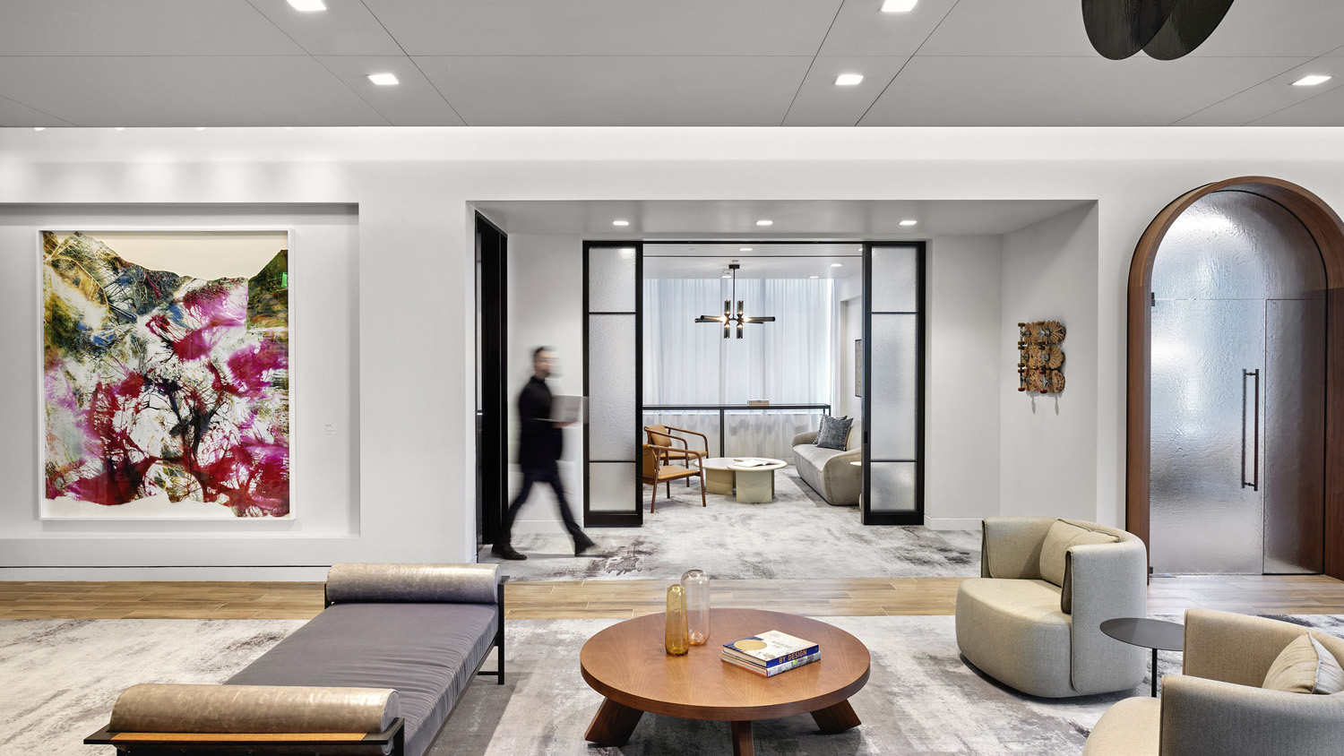 During the early phase of the pandemic, this New York-based financial institution, anticipating the future, engaged IA to radically reimagine its standard executive-client/workplace-center as a hybrid-work environment to reduce desking, transition to free address, and blur the lines between client hospitality and employee social spaces.