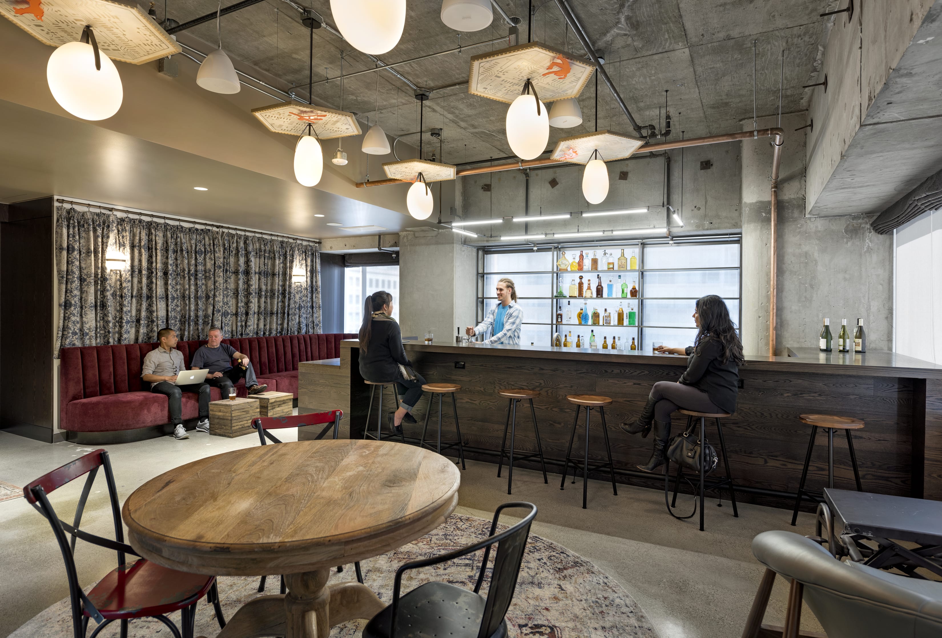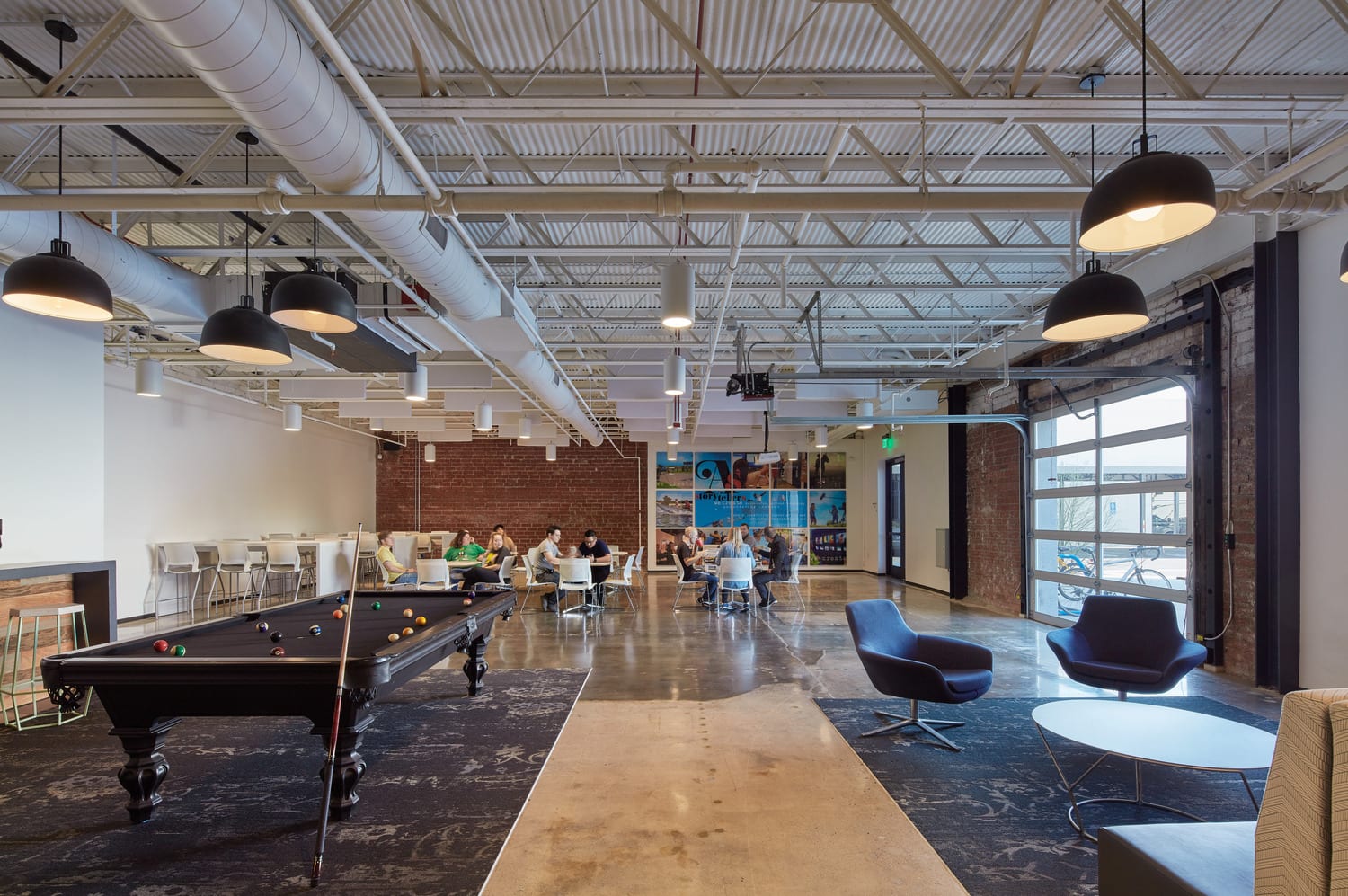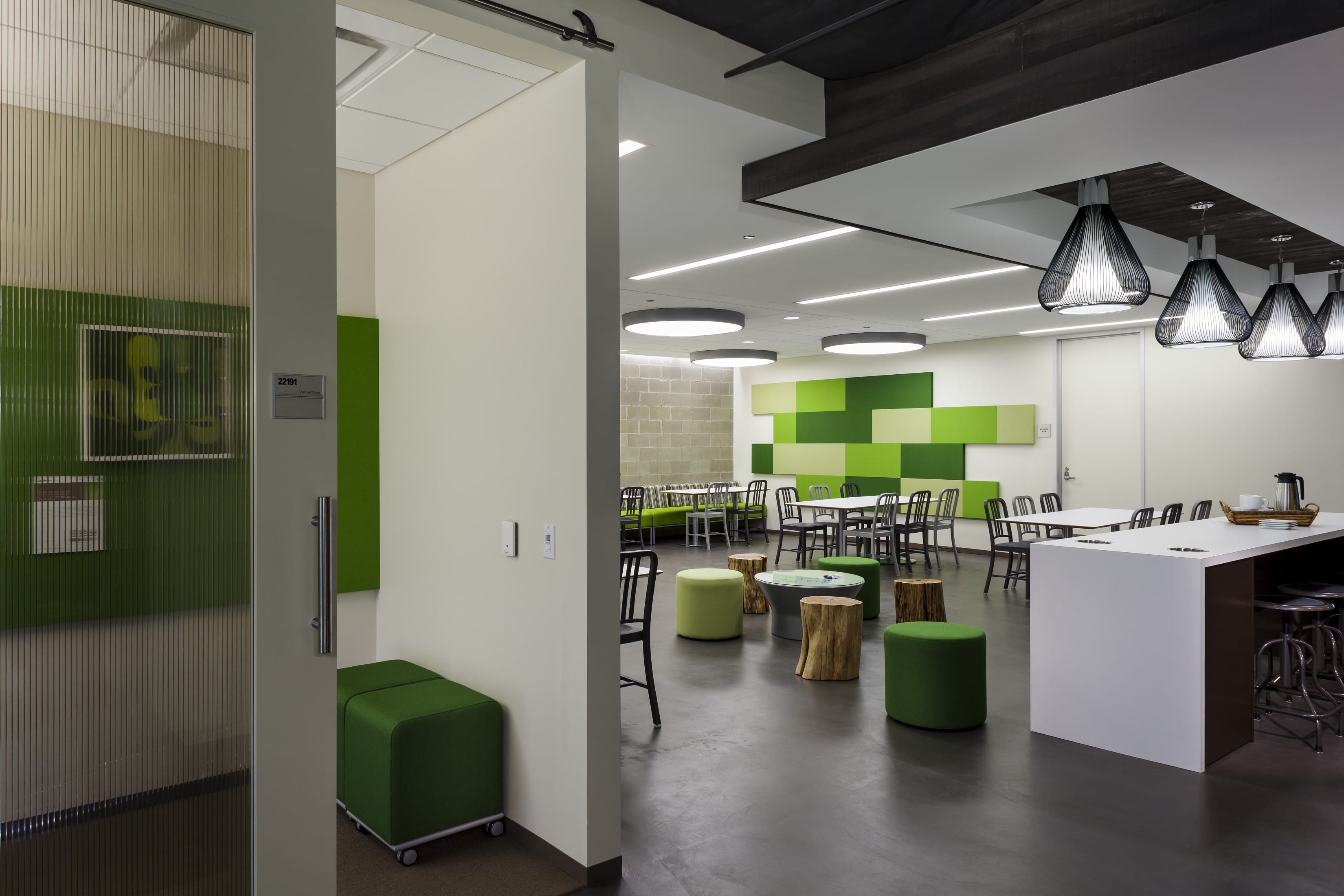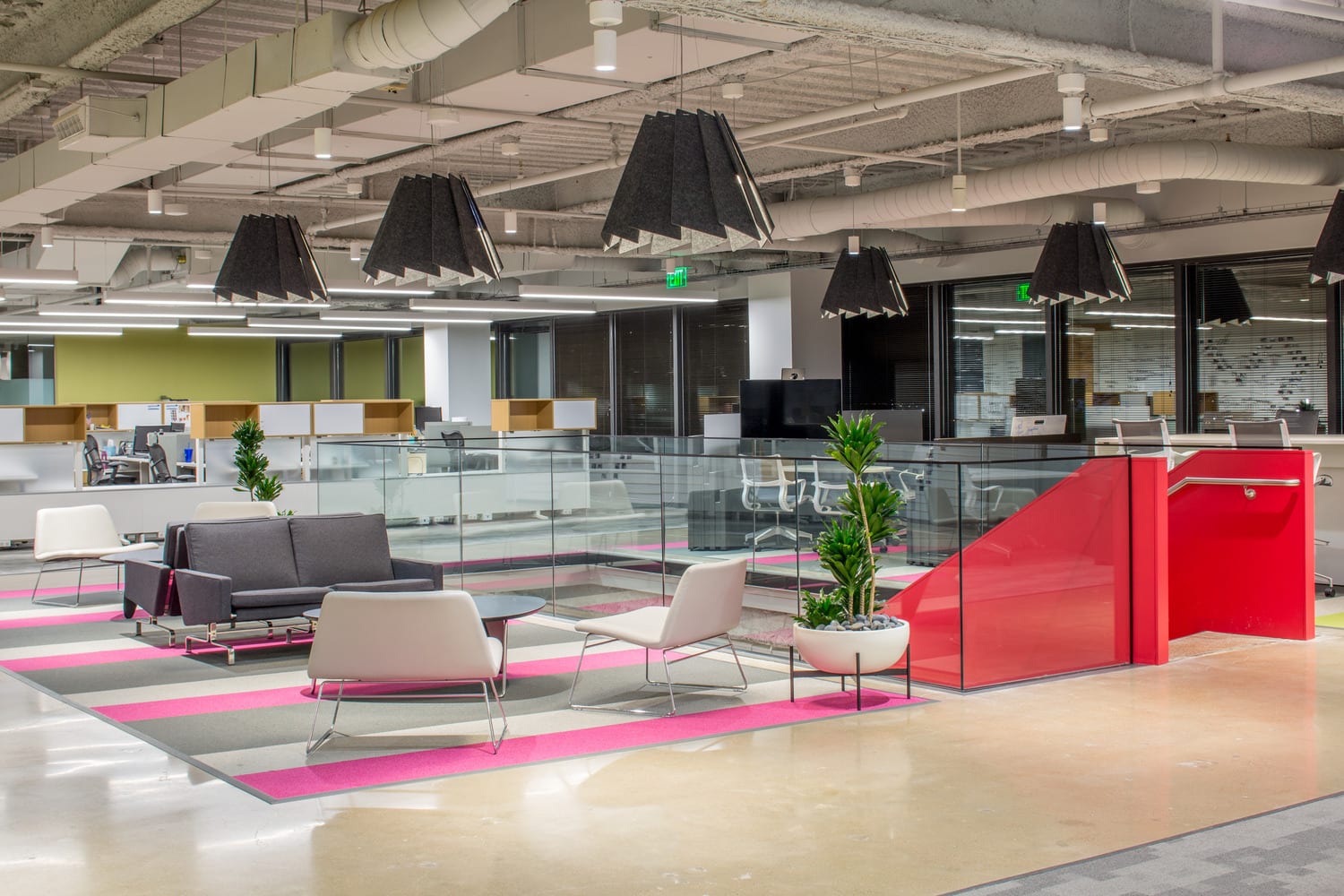 When it came time for the team at Match.com to renovate their office space, they knew that they wanted to keep things flexible. IA developed a plan that included reconfigurable office spaces with modular desking systems, and a mostly open plan. The IA team decided it made the most sense to repurpose the existing concrete to feature Match.com's unique branding. This is most evident in several areas where the subtle, neutral tones of the stained concrete flooring frames the bright pops of color featured in the unique carpeting throughout. Says David Holt, Design Director for the project, "We polished the existing concrete. It wasn't quite a mirror, but it was pretty shiny as the client wanted a balance between the refinement of a polish and the scrappiness of all the cracks and imperfections. We used no topping anywhere."