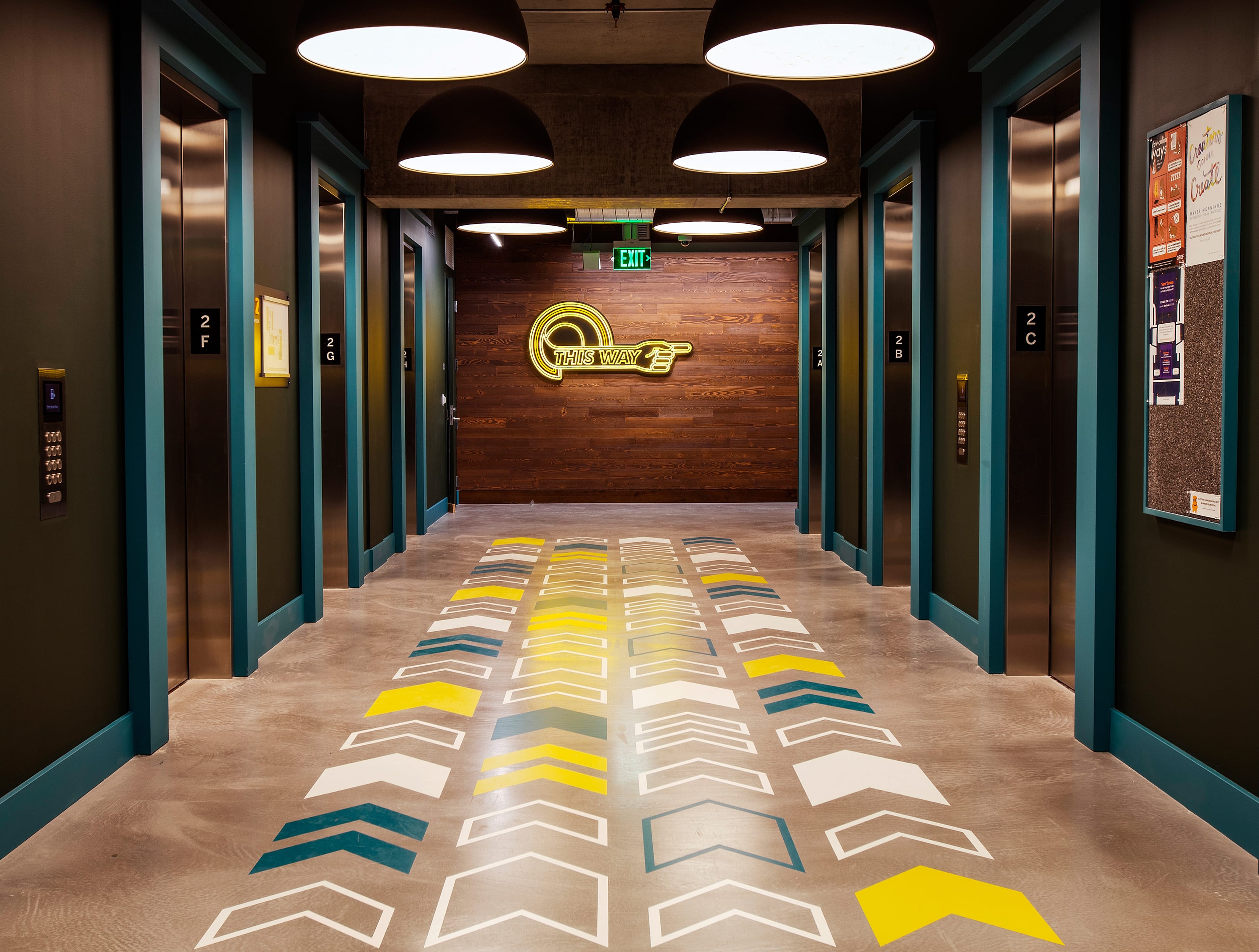 Similarly, a Seattle-based tech giant found that they had needs in common with the above example. They had certain spaces that would be high-traffic areas utilized by a large number of professionals. As IA was brought on to help define workplace standards and strategy, we soon identified the importance of wayfinding signage in this client's space, and made sure to have a little fun with their existing branding. The end result was a heavy reliance on EGD on stained concrete surfaces throughout the building that incorporated homages to local culture, company branding, and a high degree of practicality.