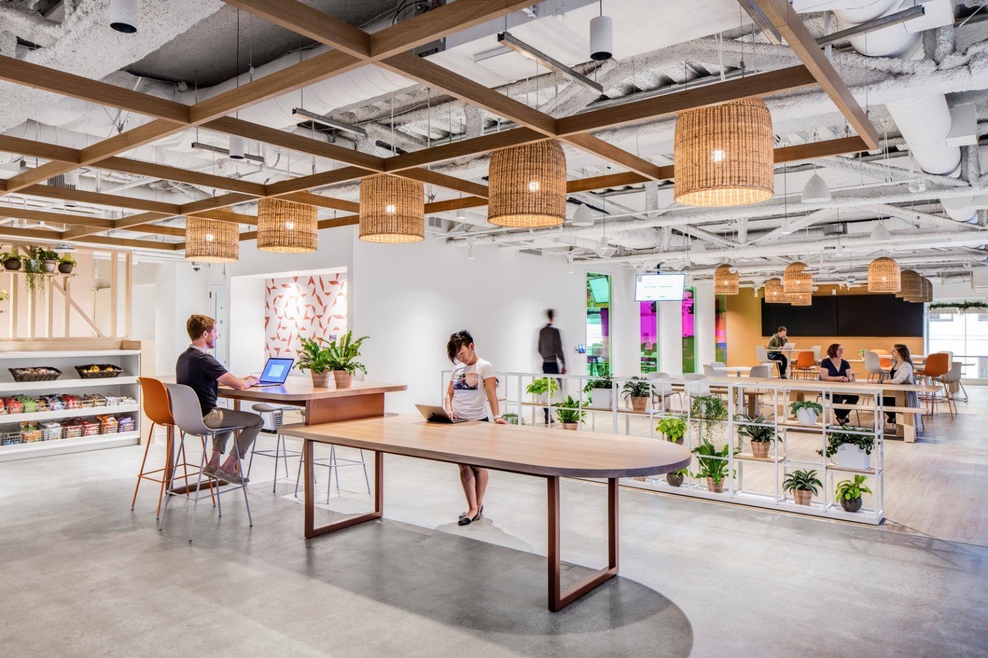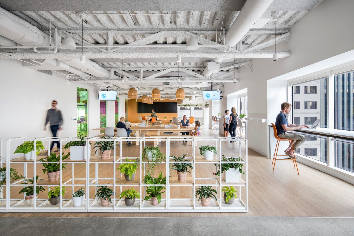 Refinished and repurposed cable trays above the windows—an innovative design feature—contain live, resilient plants, one of many biophilic touches integral to the design. Low-maintenance plants displayed on white-wire shelving units divide space throughout the floors.