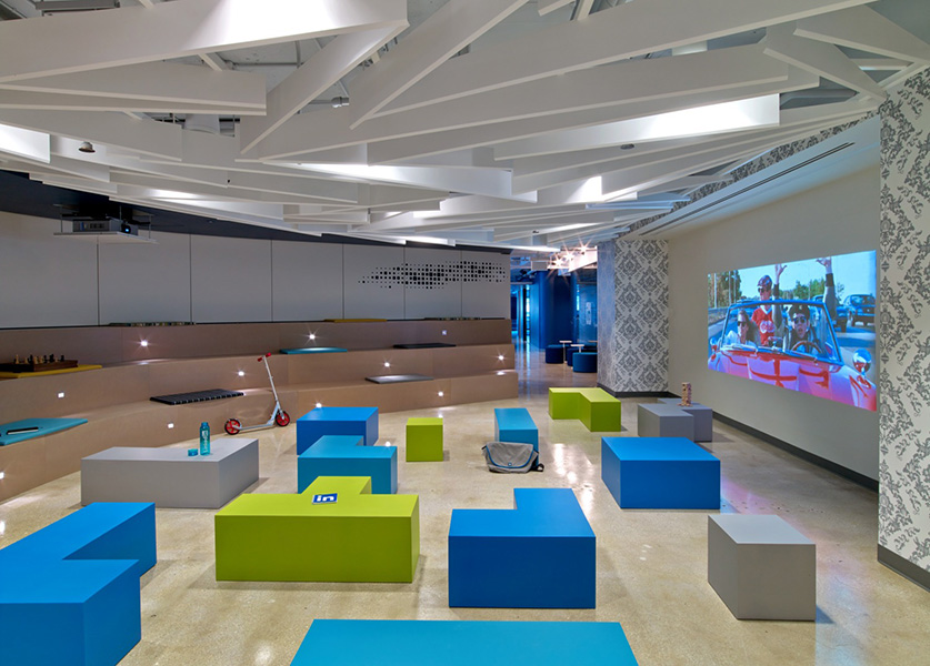 To address key project drivers of connecting and recharging staff, LinkedIn’s Windy City location features a screening room with comfortable foam seating that can be repurposed for viewing parties and town hall meetings with equal ease. Multiple generations can use the screening room to come together through one of the original methods of storytelling.