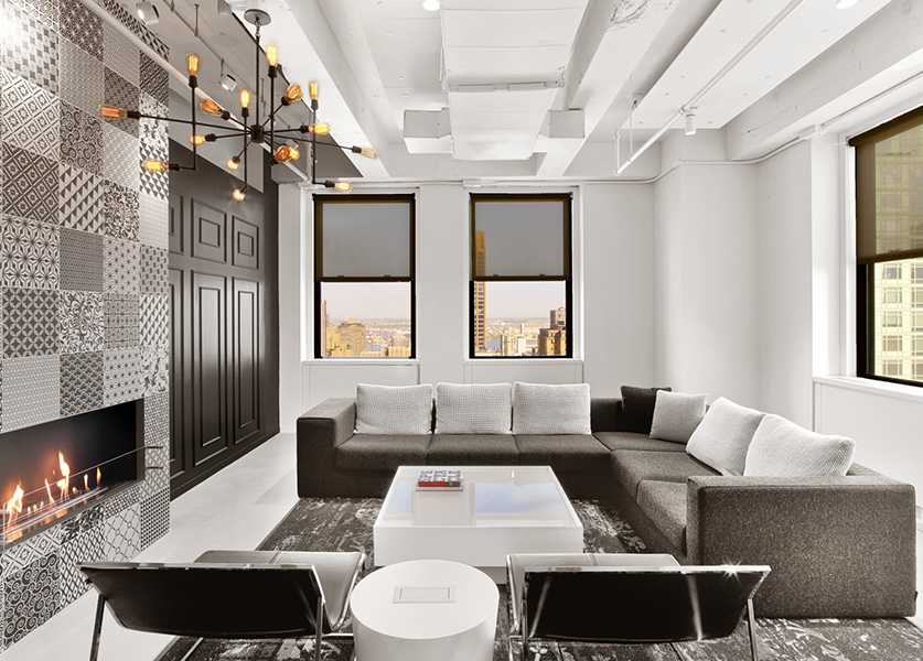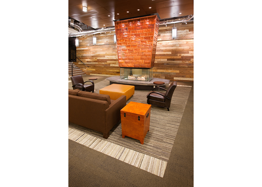 LinkedIn in New York. Photo by Eric Laignel.The monochromatic tones in this lounge look very cool, but the blazing fire in the hearth is not.