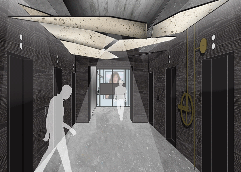 With a nod towards this design philosophy, IA designed a cutting-edge ceiling prototype to create a nest-type habitat constructed of wood pieces, inspired by maker culture. Shown here in an elevator lobby, the ceiling resembles parts of a bird, mechanically operated by a series of gears.