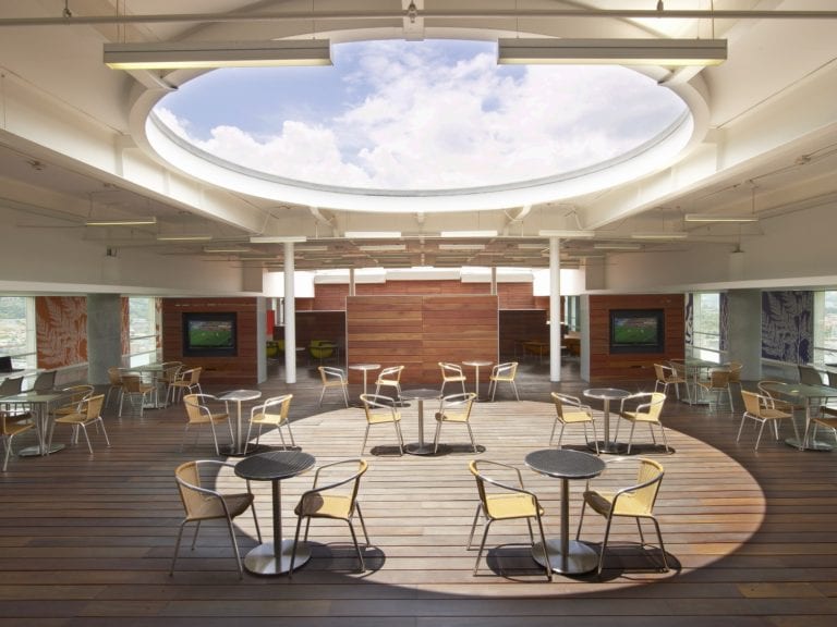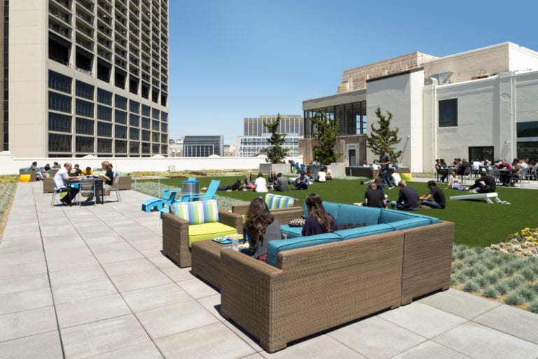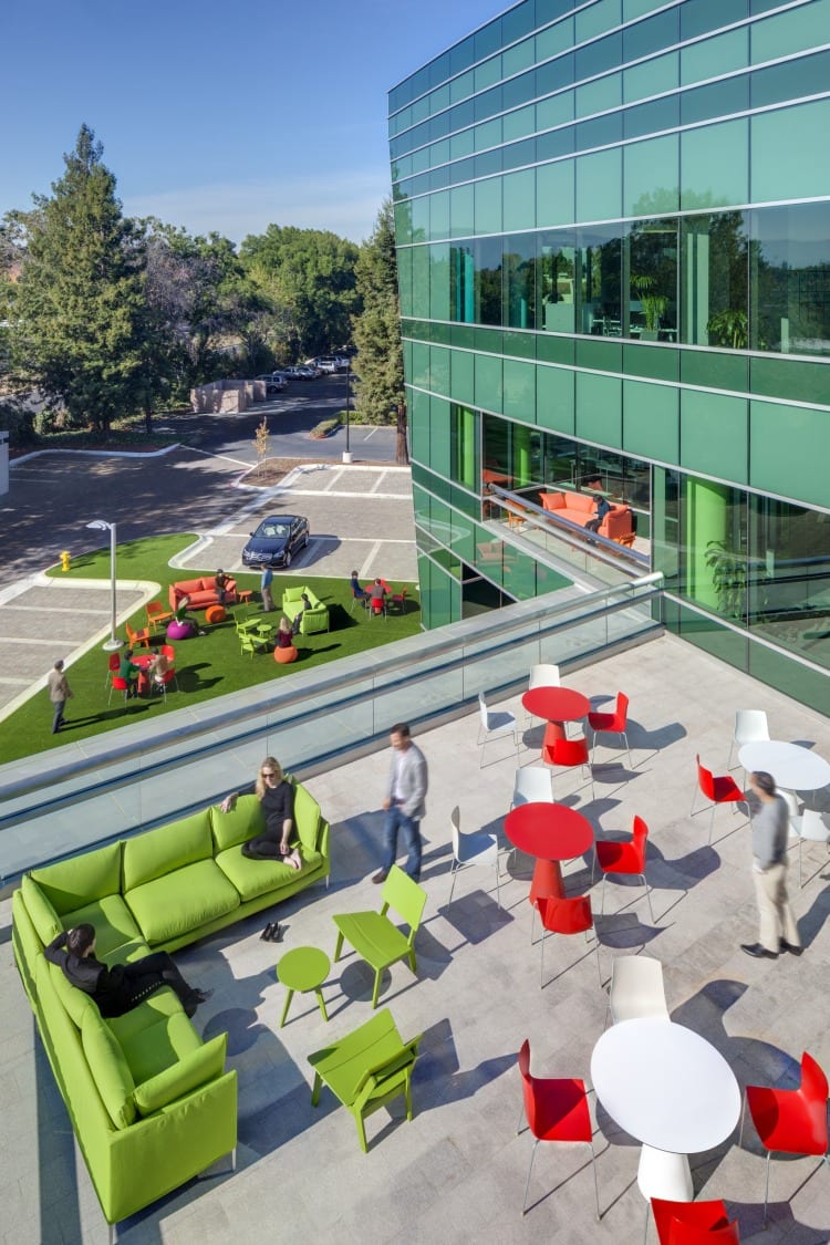 A rooftop terrace and lower level outdoor seating area at Mercedes-Benz Research & Development in Palo Alto, CA. Photo by Sherman Takata.