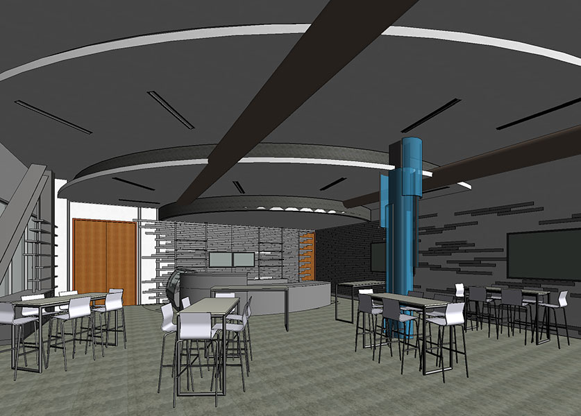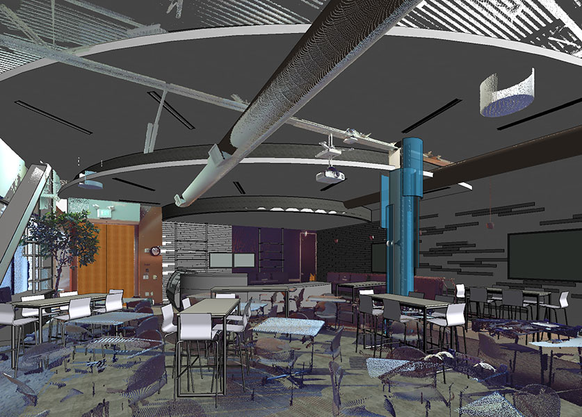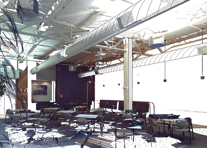 Hoffman also found the point cloud helpful in determining the locations and measurements of components not easily acquired during site surveys, such as ceilings and duct work. “Our design for the coffee bar included a very involved ceiling and it was necessary to accurately locate the existing ductwork and beams,” she explains. Using the point cloud, the team was able to design a new ceiling component around the existing ceiling elements much faster and more accurately than would have otherwise been possible. The alternative would be measuring and recording the space by hand and noting those numbers on drawings.