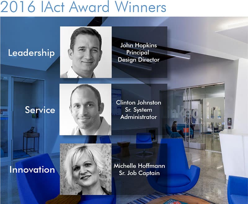 “Ultimately, IA recognizes that our people are truly what make us special – a world-class design firm that cares deeply about our clients, about our profession and about one another. We are proud of the IAct program and congratulate and honor Michelle, John and Clinton as the 2016 winners,” noted Jennifer Hatton, Managing Principal of Client Services.