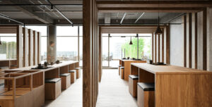 Minimal structural modification preserves site integrity and supports sustainability, allowing for an easy transition when Blue Bottle’s tenancy is over. Taupe concrete tiles, Krion counters, and maple millwork further support the brand's environmental stewardship.