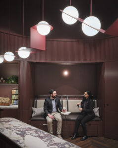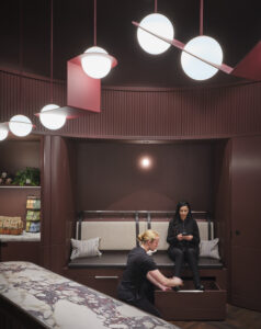 The space projects a serene and inviting atmosphere, achieved through a balanced palette of muted burgundy lacquer (influenced by adjacent bridges), and luxurious closed-pore wood paneling.