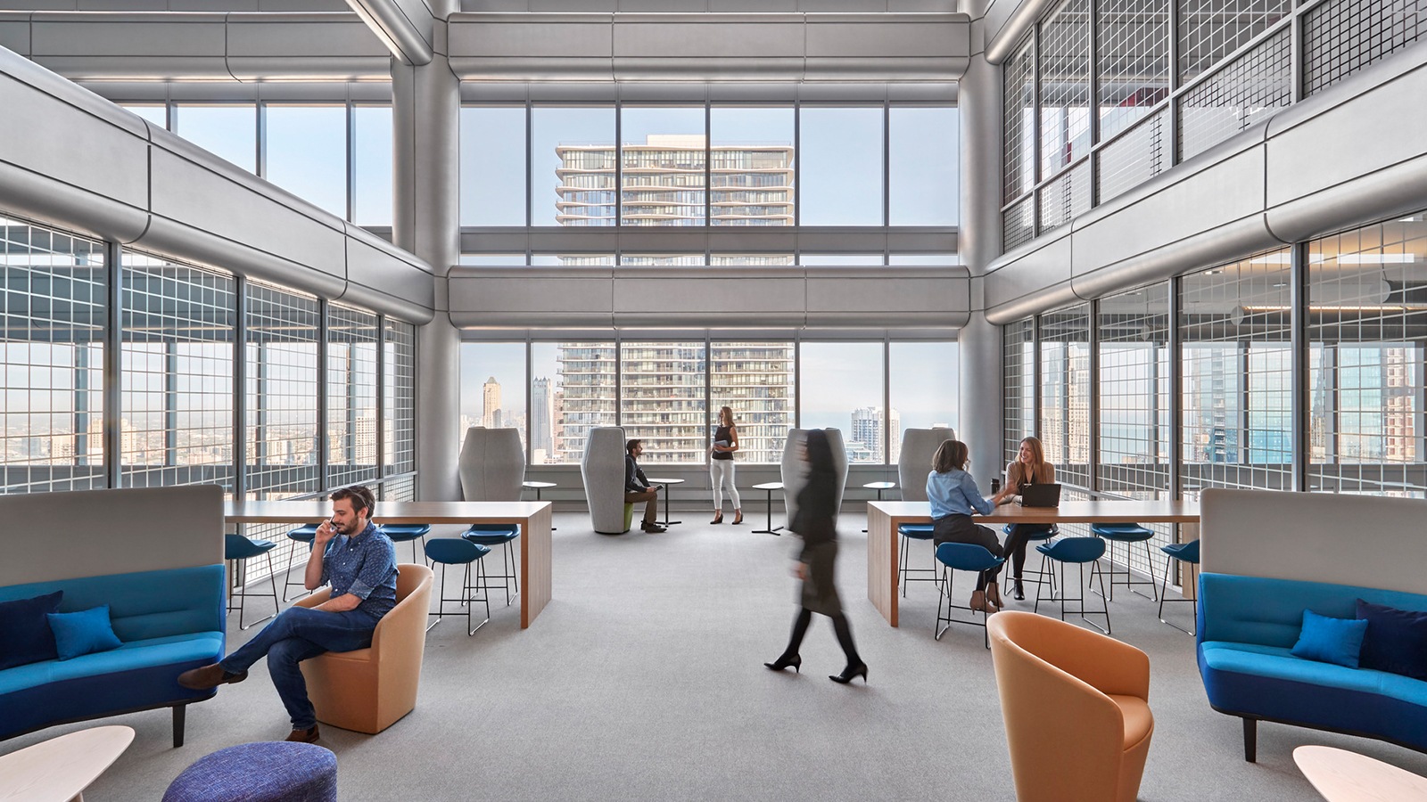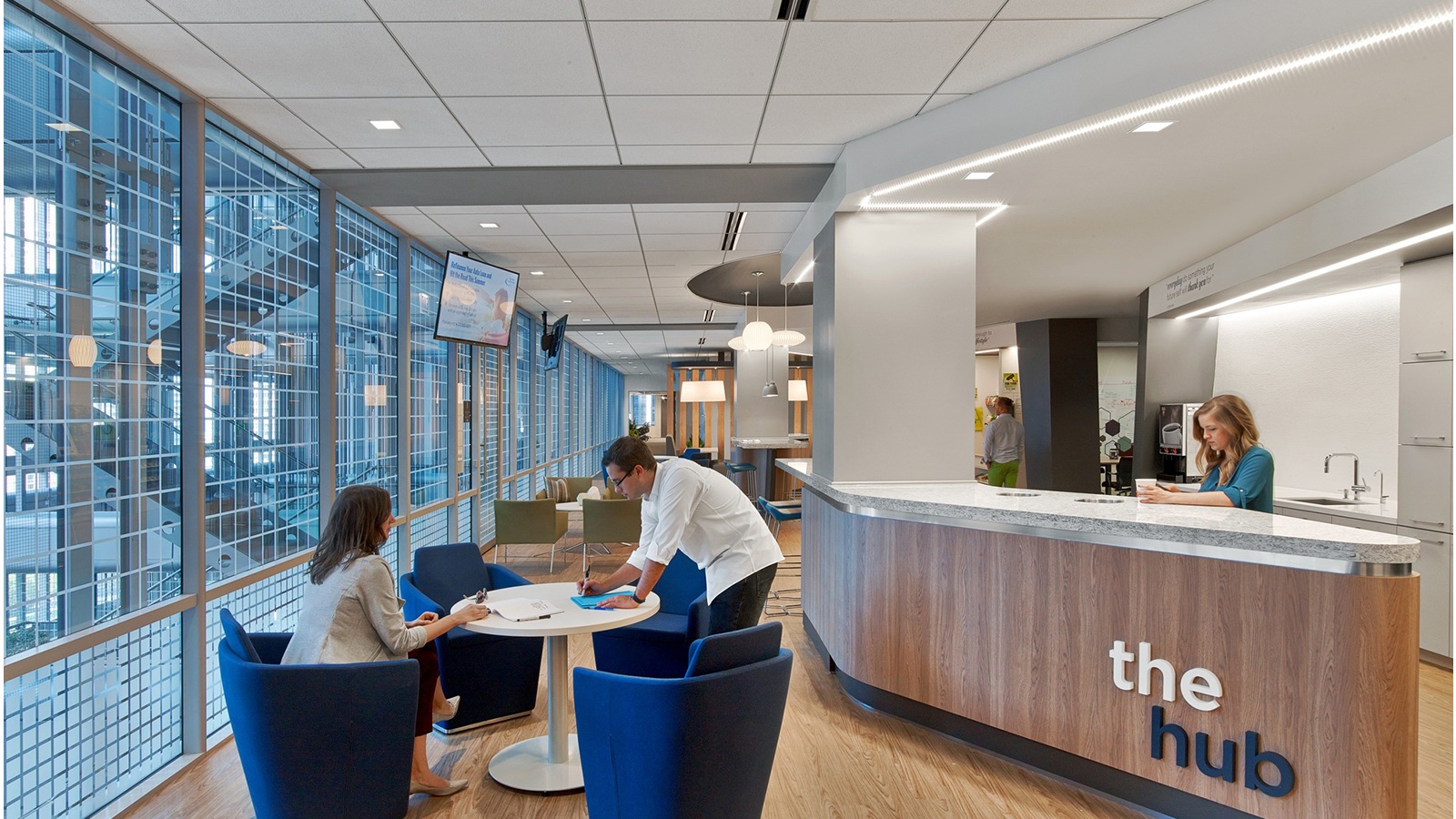 Once the strategy was set, each of the seven floors were designed and constructed in phases over the last five years. A variety of teaming rooms and break-out areas support formal and informal collaboration. The pantry, also known as “The Hub," serves as both an eating area and a workspace, allowing employees to socialize, work in a different setting, and have impromptu meetings throughout the day. A whole floor is dedicated as a "university" environment for firm-wide training.