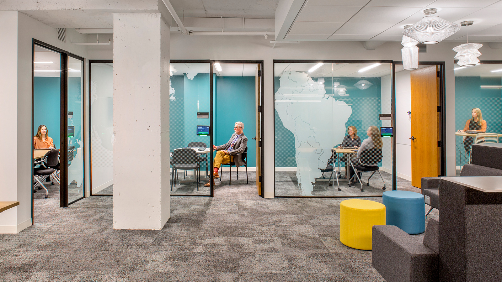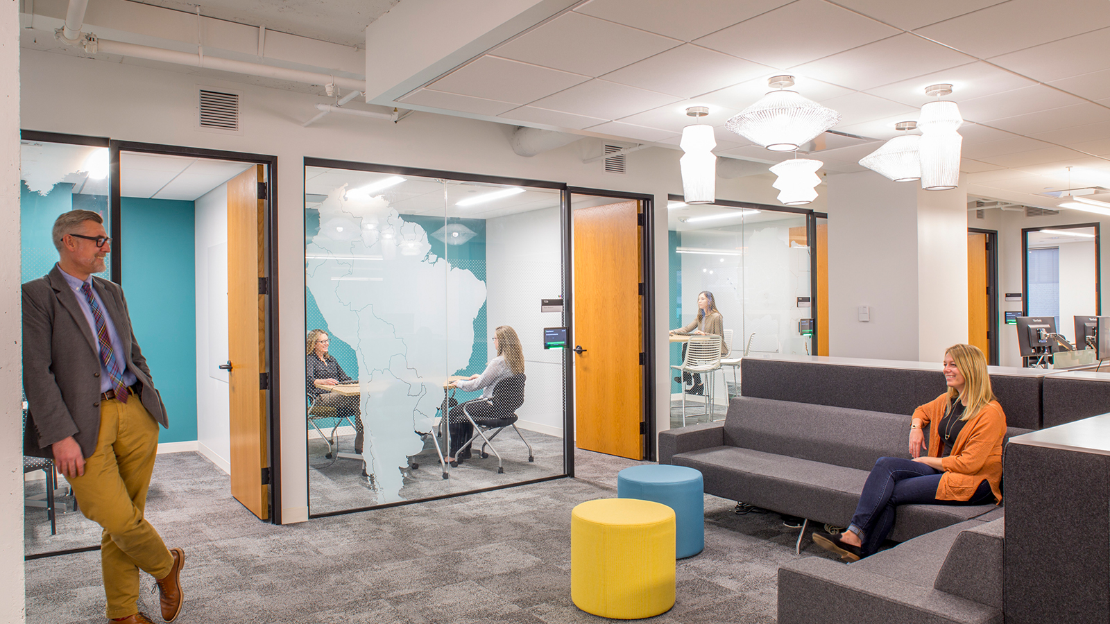 Custom graphics throughout the space, including a world map and a donor wall that features donor names and beneficiary portrait photography, also emphasize the organization's global mission. Transitioning from a traditional cubicle environment, the new workspace is organized into neighborhoods with benching and full-height partitions to provide visual privacy.