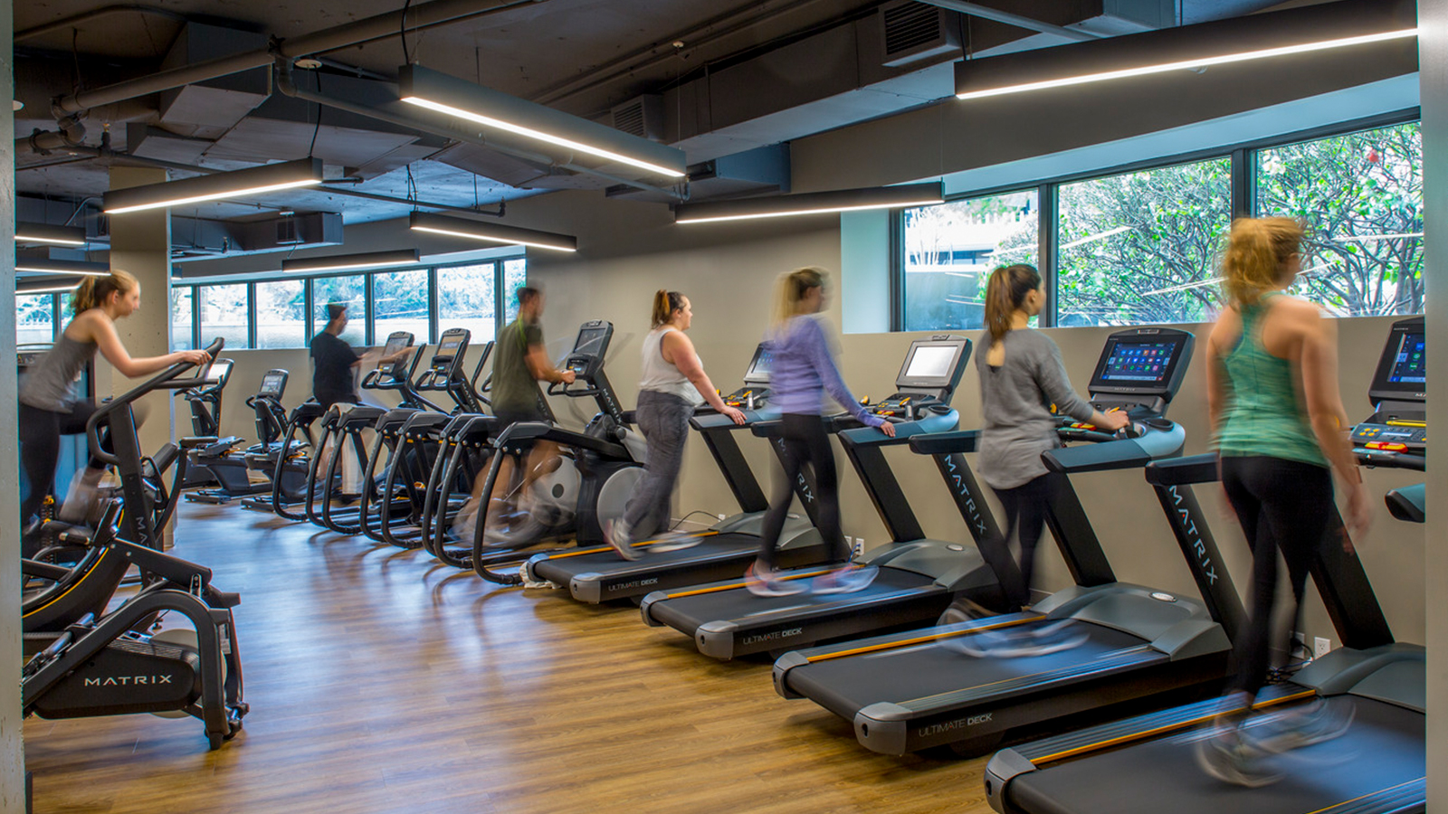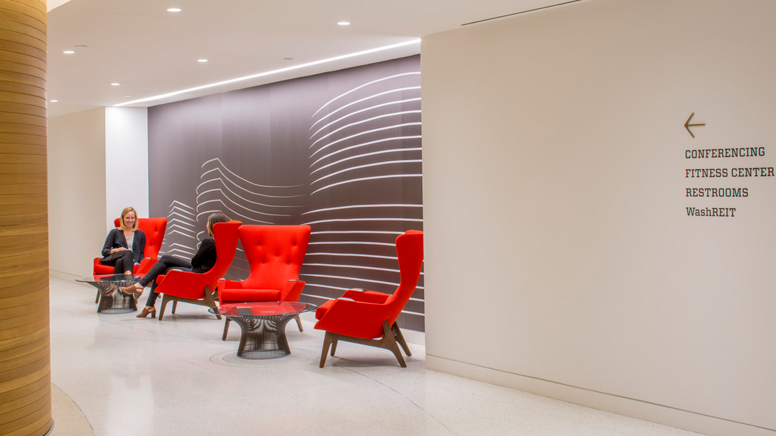 Through the application of experiential graphics, the amenity center is branded to marry with the graphics used throughout the rest of the building and to the color palette of the adjacent Kennedy Center. Custom wall graphics in the lounge and fitness center offer a subtle nod to the curved building shape.