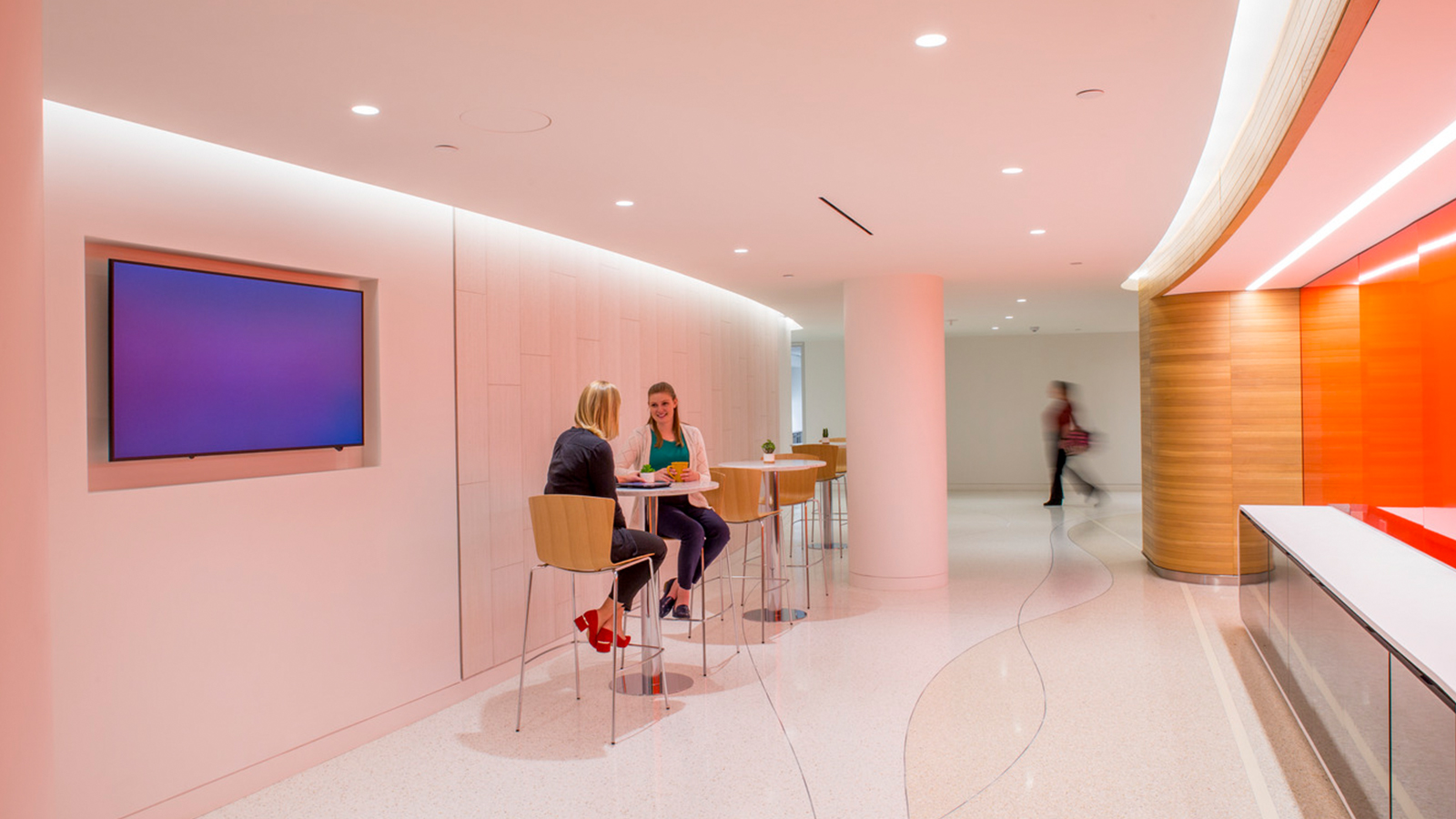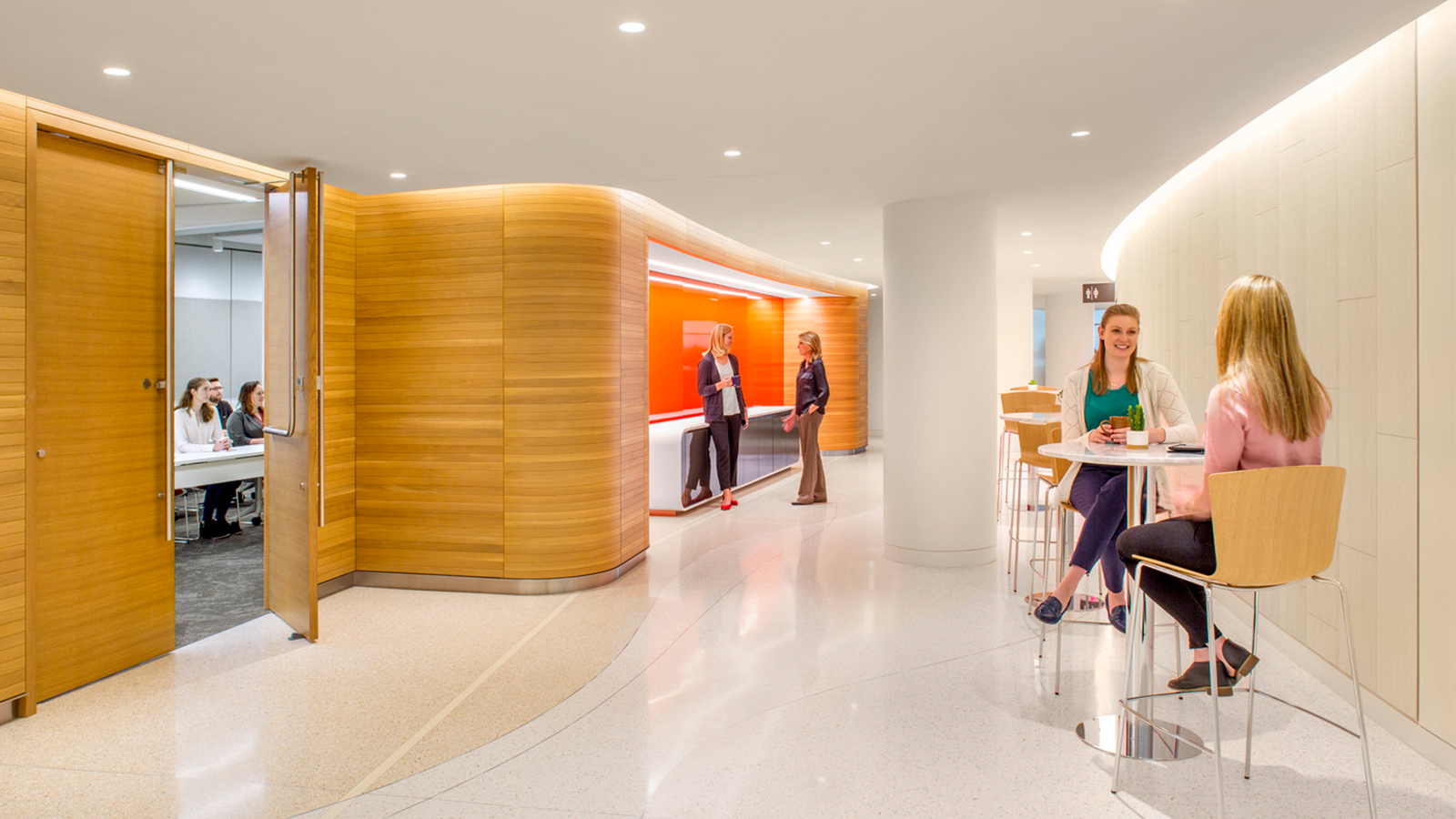 The curvilinear base building plan influenced the layout, detailing, and aesthetics of the space. The curved wood wall and sinuous terrazzo flooring—inspired by the Potomac River—act as wayfinding elements to lead occupants from the elevator lobby to the conference center.