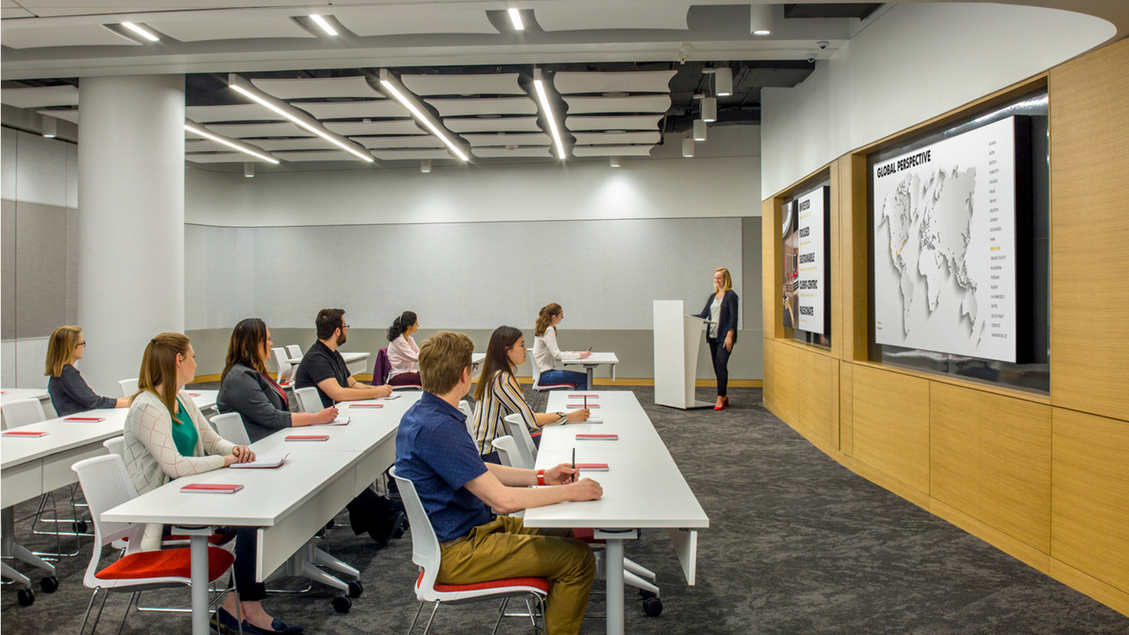 The flexible conference center features an operable partition, uniquely-designed for the curvature of the room, that allows for the room to be utilized as either one large or two smaller conference rooms, depending on the needs of the occupants. The operable partition maximizes functionality and acoustic performance, while circumventing the need for folded panel storage or a recessed ceiling system. The selected conference center furniture is easily reconfigurable into traditional conferencing-, auditorium-, and training-style layouts.