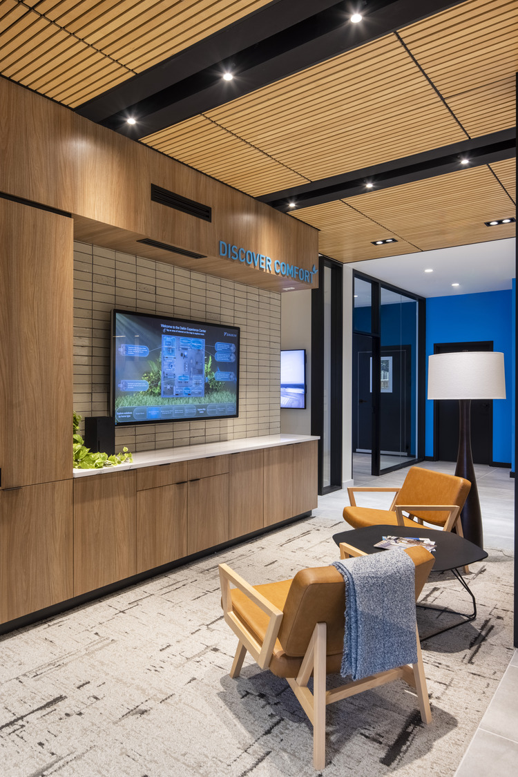 The experience is enhanced with subtle yet effective digital brand elements and interactive product displays that provide insights into the technologies at work. One of the standout features of the space is an innovative Hot and Cold Experience Room, designed to showcase Daikin’s cutting-edge systems in action. In this immersive environment, visitors can feel the dramatic temperature range firsthand, from a brisk -4°F to a cozy 80°F. This interactive demonstration highlights the system’s impressive efficiency and versatility, offering a tangible understanding of its performance. Beyond showcasing products, the showroom also supports collaborative interactions with partners and contractors, blending consumer-friendly features with workplace functionality.