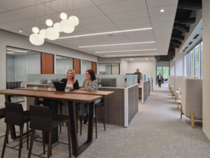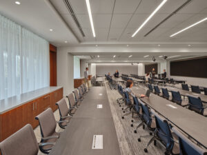 The two-level renovation includes a cafeteria, conference and training center, fitness center, and newly added multipurpose and social hub along with a game room. Wellness rooms, mother’s rooms, personal reflection rooms, and gender-neutral restrooms emphasize inclusivity.