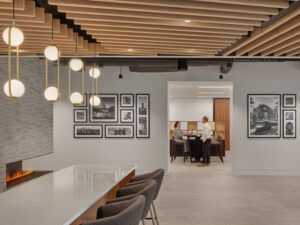 The GIRA workspace, in contrast to its DC counterpart, is focused on an internally facing program design to support training and corporate functions. A homecoming design concept creates a comfortable, residential-like atmosphere to encourage employees back to the office. Throughout the amenity spaces, salvaged cherrywood paneling from the elevator lobby introduces a warm, midcentury aesthetic with cherrywood accents that contribute to the feel of home. The workplace design is agile with a 2:1 sharing ratio for flexible seating options combined with open collaboration spaces, private phone and focus rooms, and individual seating for focused work.
