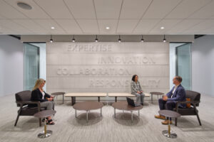 FINRA’s consolidation project involved merging its three-building Rockville, Maryland campus into a single, long-term leased building. The initial 61,000-square-foot renovation focused on modernizing the entry-level and adjacent support and amenity spaces.
