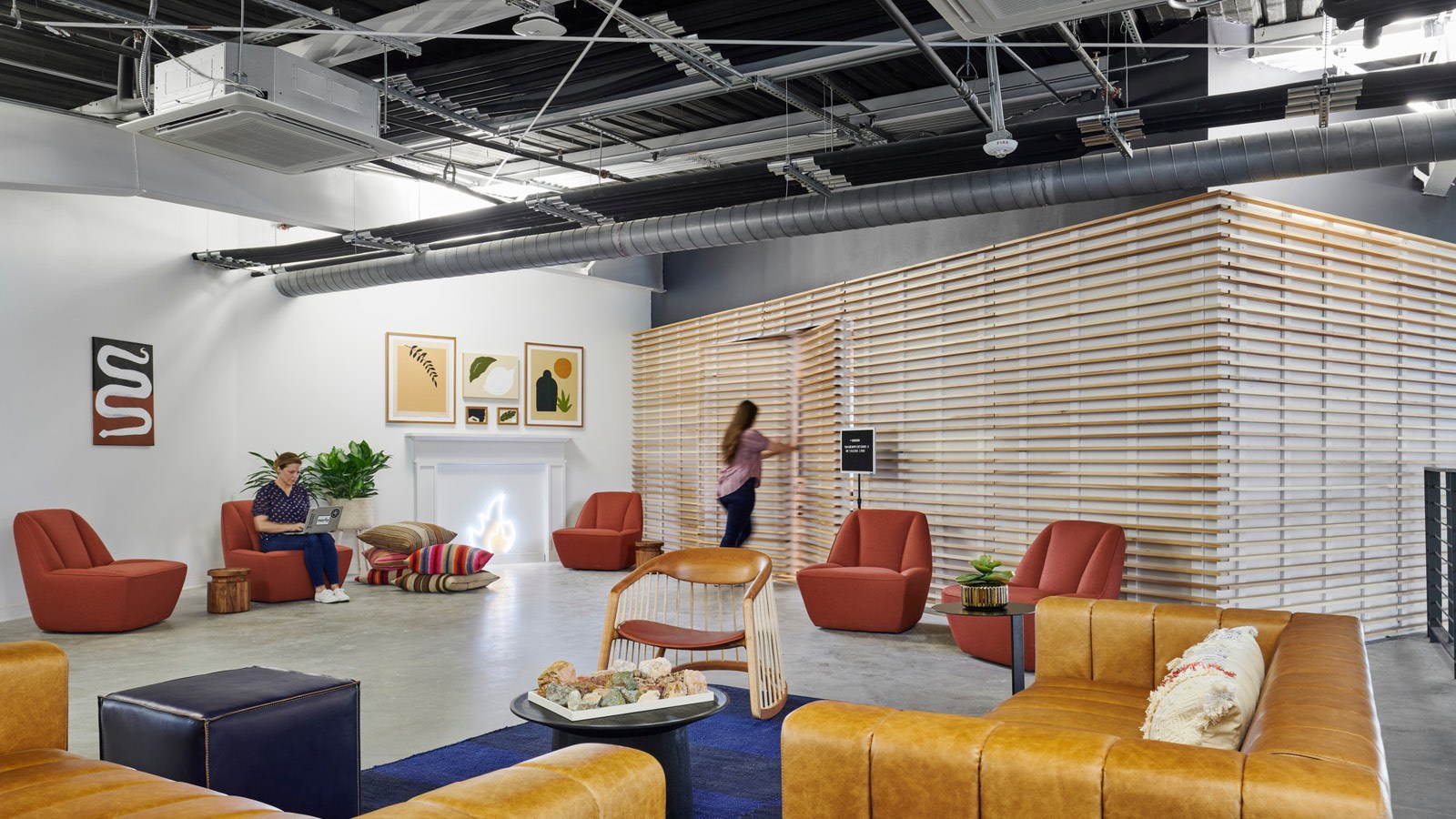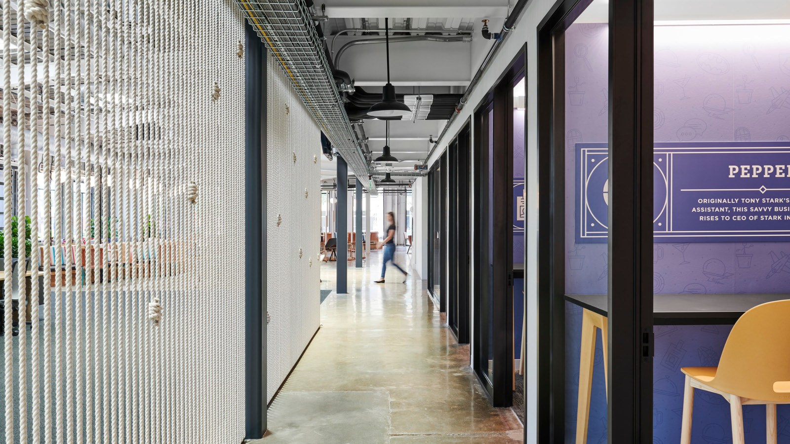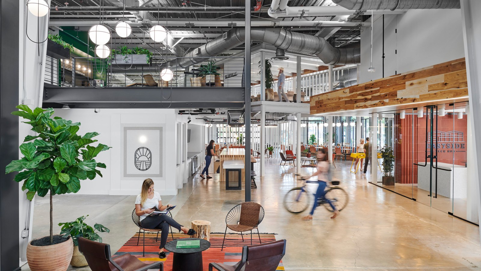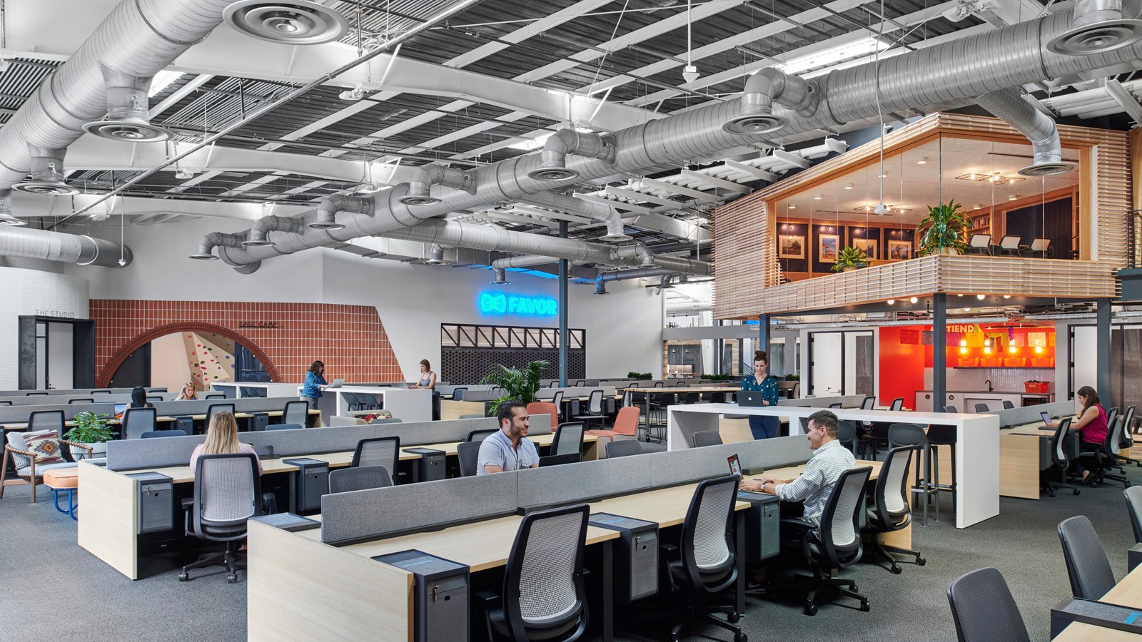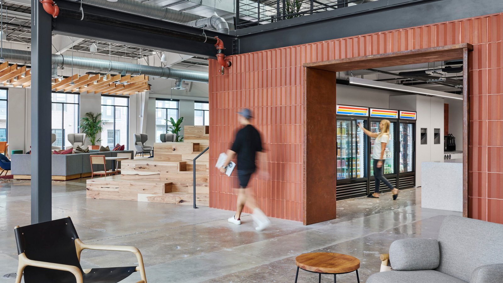 - Amenity spaces include an expansive work lounge that transforms into an all-hands zone, a quiet zone with a library, a series of branded coffee bars, wellness rooms, and a double-height climbing wall