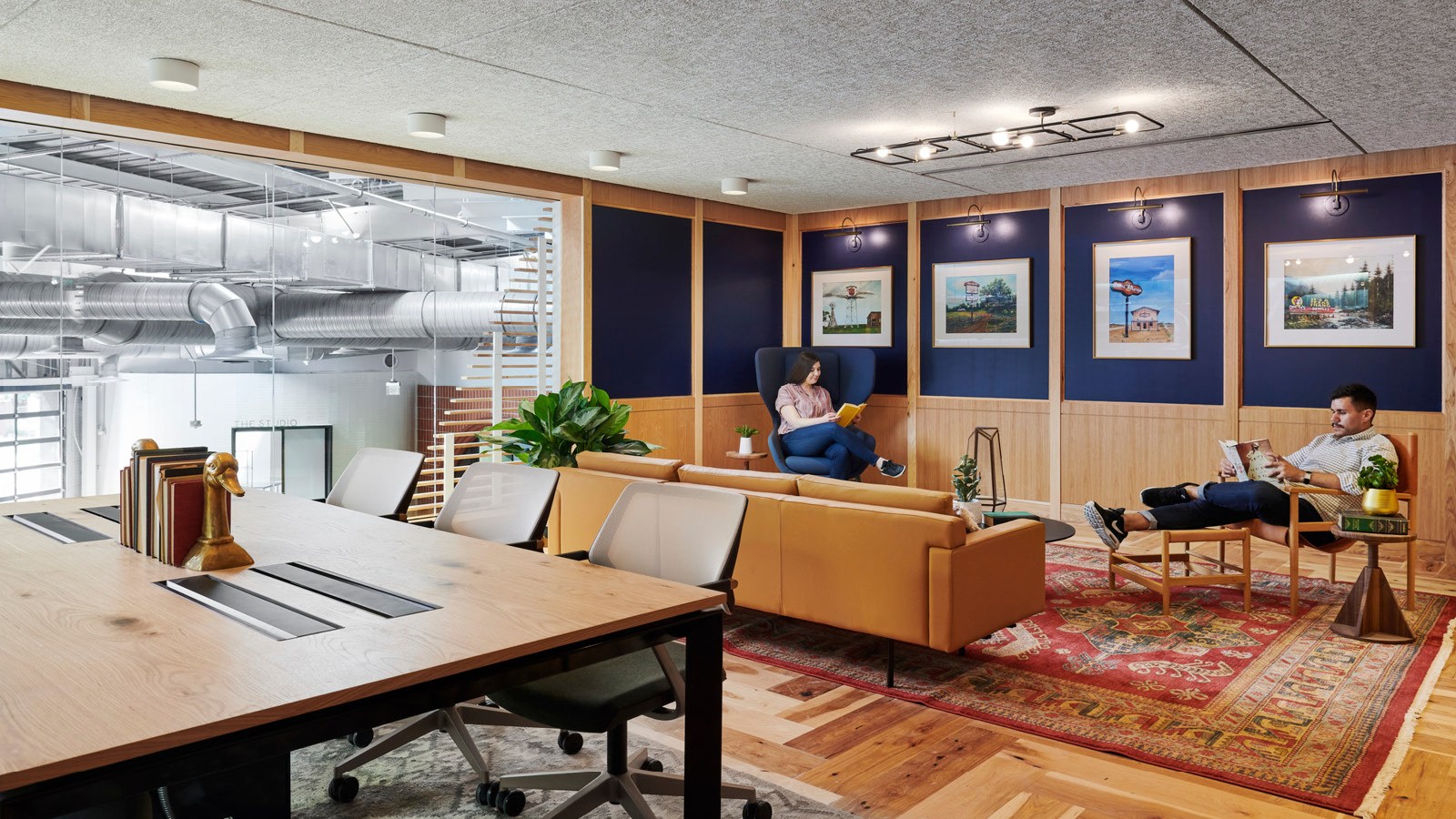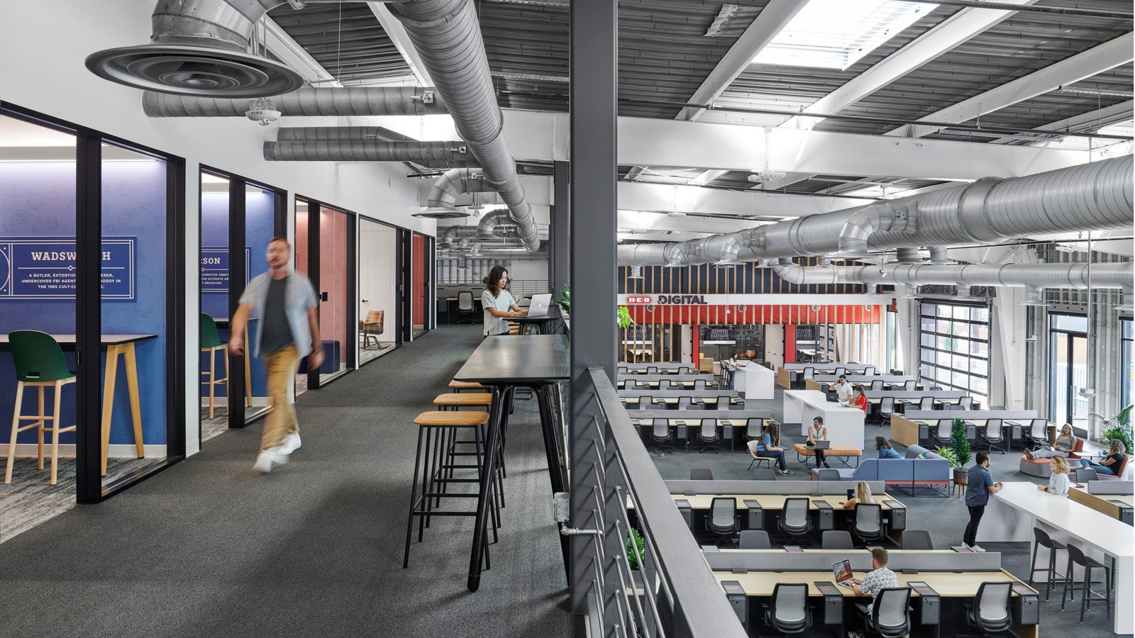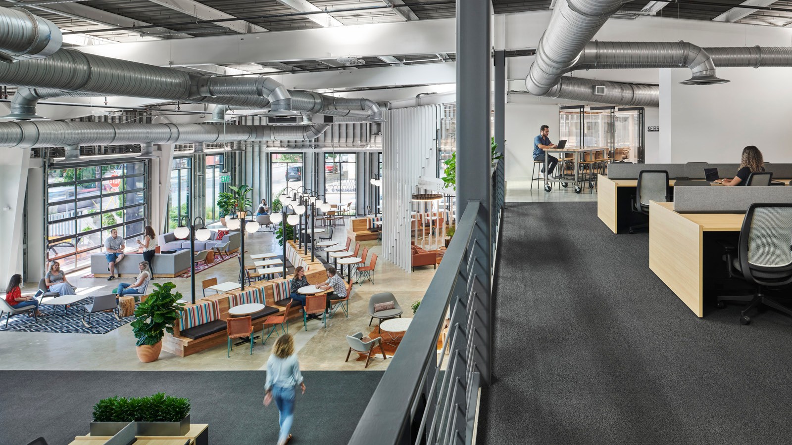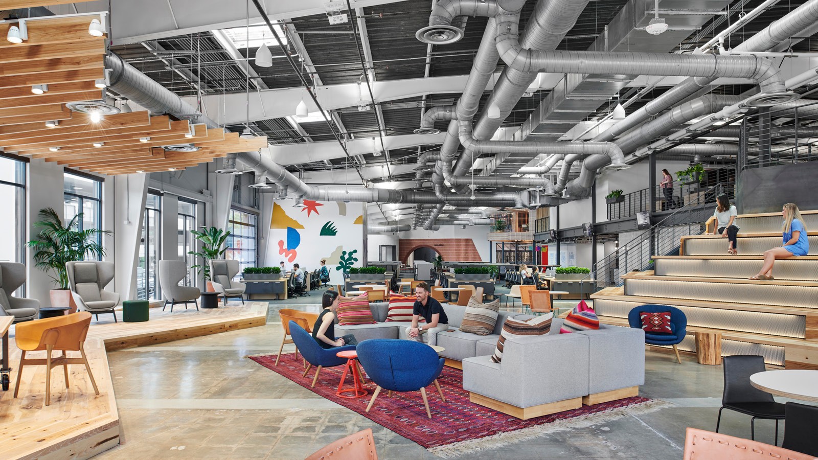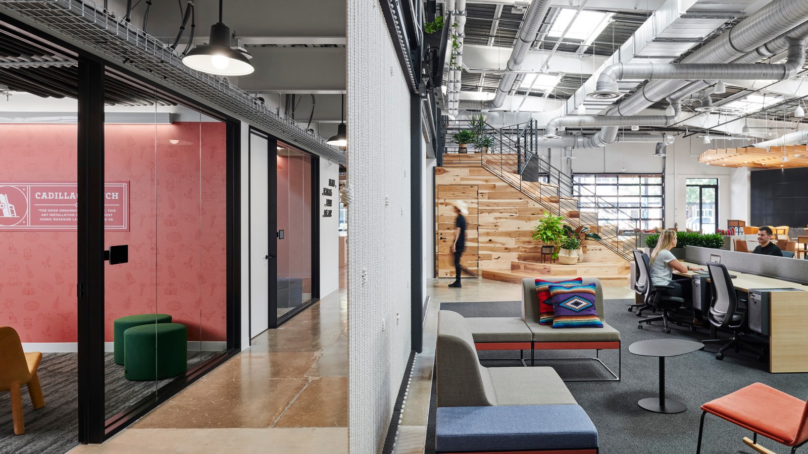 - Amenity spaces include an expansive work lounge that transforms into an all-hands zone, a quiet zone with a library, a series of branded coffee bars, wellness rooms, and a double-height climbing wall