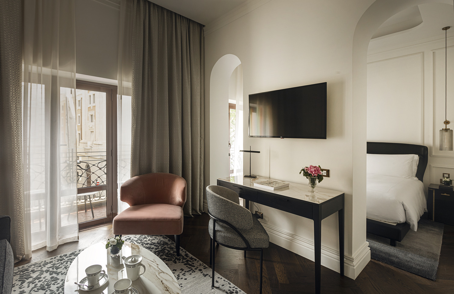 Guest rooms and suites were meticulously crafted with a timeless Italian aesthetic. The executive suites showcase arch motifs that elegantly divide the living spaces, drawing inspiration from local luxury apartments.