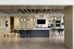 The existing atrium stair is transformed into a dynamic community space with tiered seating, break areas, prominent graphic panels, and a custom chandelier. Pantries on both floors add to the activity, encouraging informal encounters across departments. Key project features are a reception with custom wood accent walls, a curved ceiling soffit that creates uninterrupted sightlines, and multipurpose rooms with partitions that can open into the break area. With the new space layout, the Omaha office aims to reduce real estate costs while fostering an engaging, collaborative environment that embodies Markel’s commitment to movement, connection, and innovation.