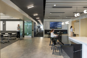A custom, abstracted train track motif—represented by CNC-routed wood wall panels and printed acoustic surfaces—reinforces the theme throughout the office, supporting movement and wayfinding emphasized by a dramatic corridor ceiling that guides flow and directs employees to collaboration hubs.