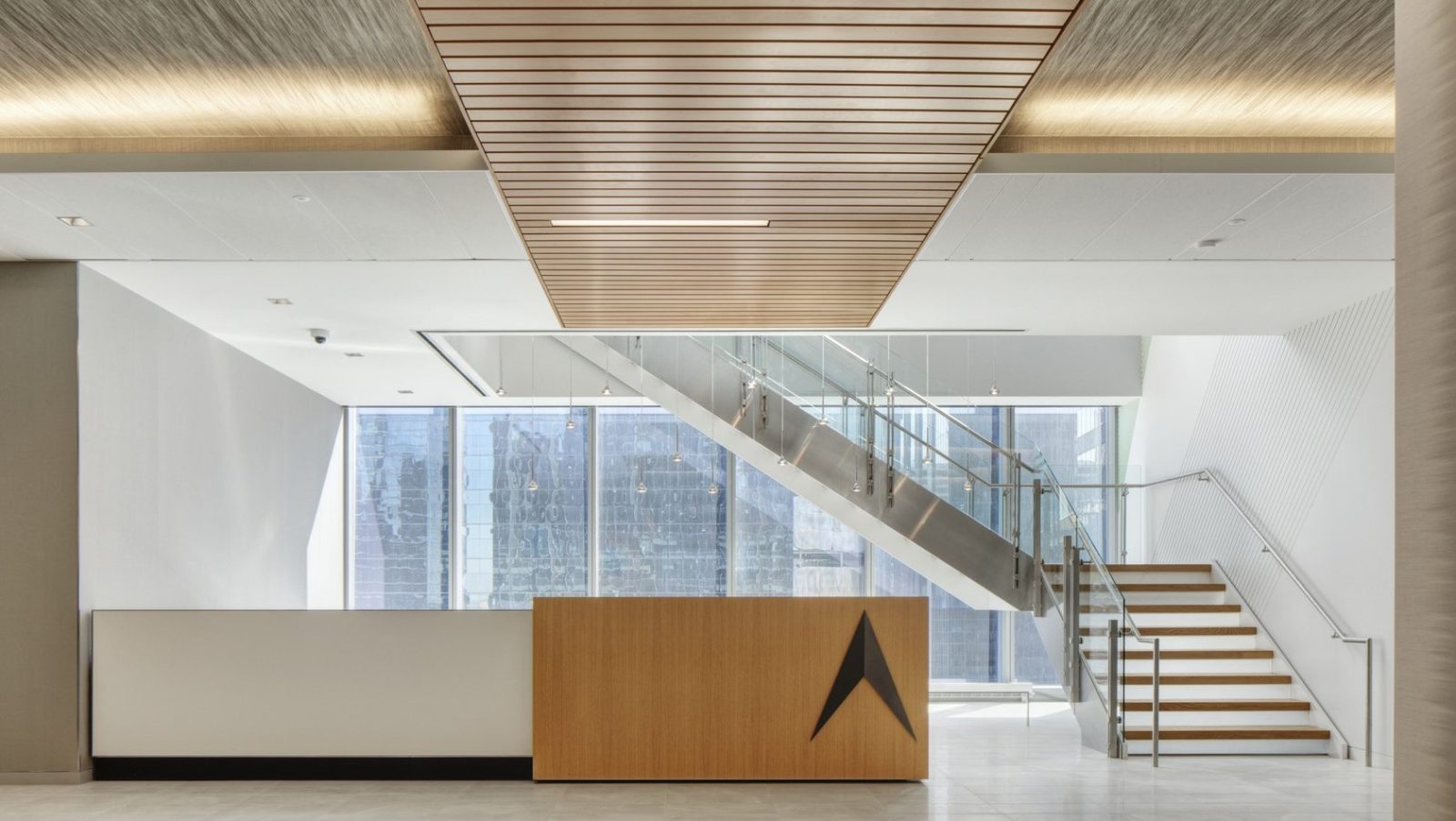 - Architectural features such as wood framing and high contrast bands used for wayfinding purposes