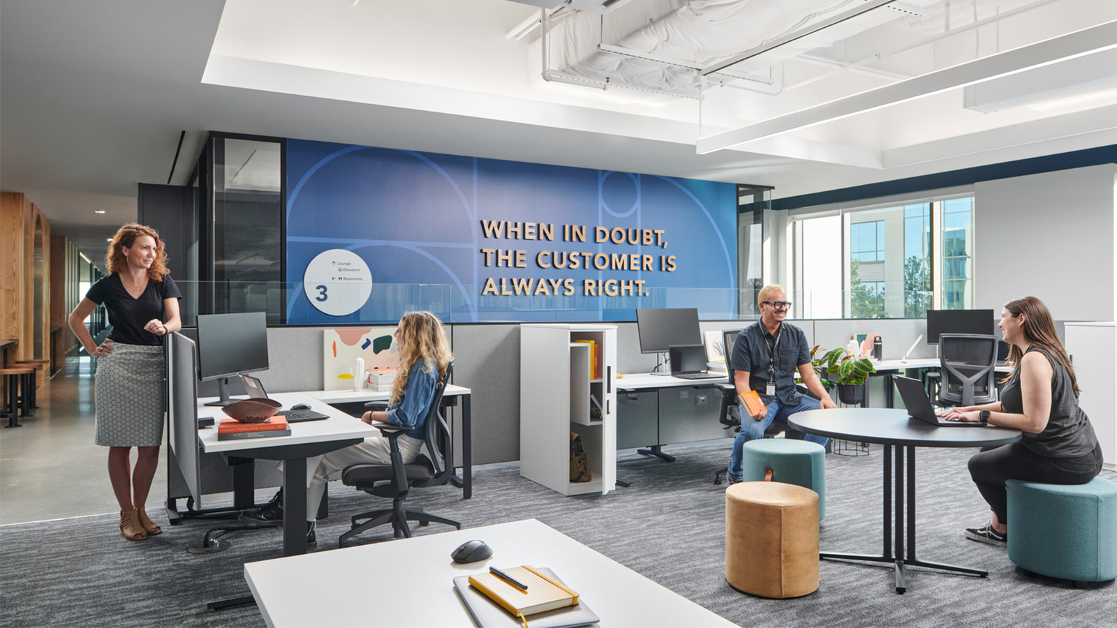 Flexibility and function anchor the layout. Q2’s teams easily flex in size and, based on need, can transform their workspaces using detachable workstations and a kit of parts. Meeting pods, defined by demountable partitions, buffer focus areas from social zones located at the center of each floor. Main client-facing areas, including the executive briefing center, command center, and large break area, are located on the first floor for a cohesive visitor experience.