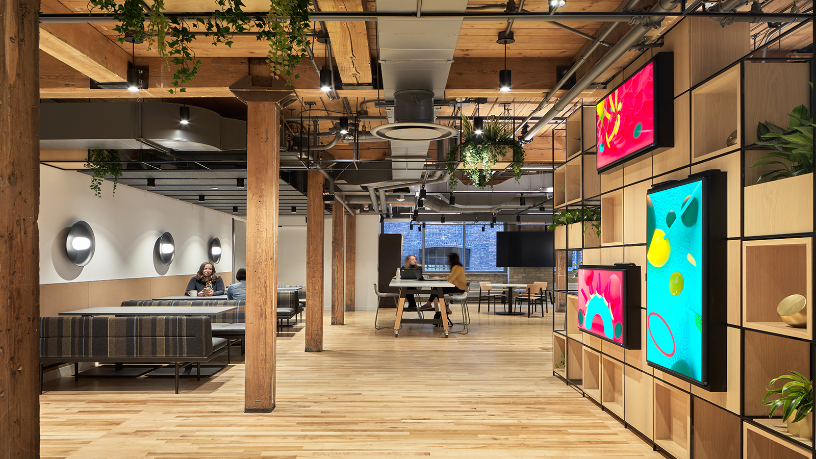 The innovation hub encompasses three floors, each with a generous kitchen, welcoming social space, and an array of amenities. In key traffic areas throughout, digital boards emphasize brand. Two of the floors can transform into a double-level town-hall venue equipped with large screens and speakers.