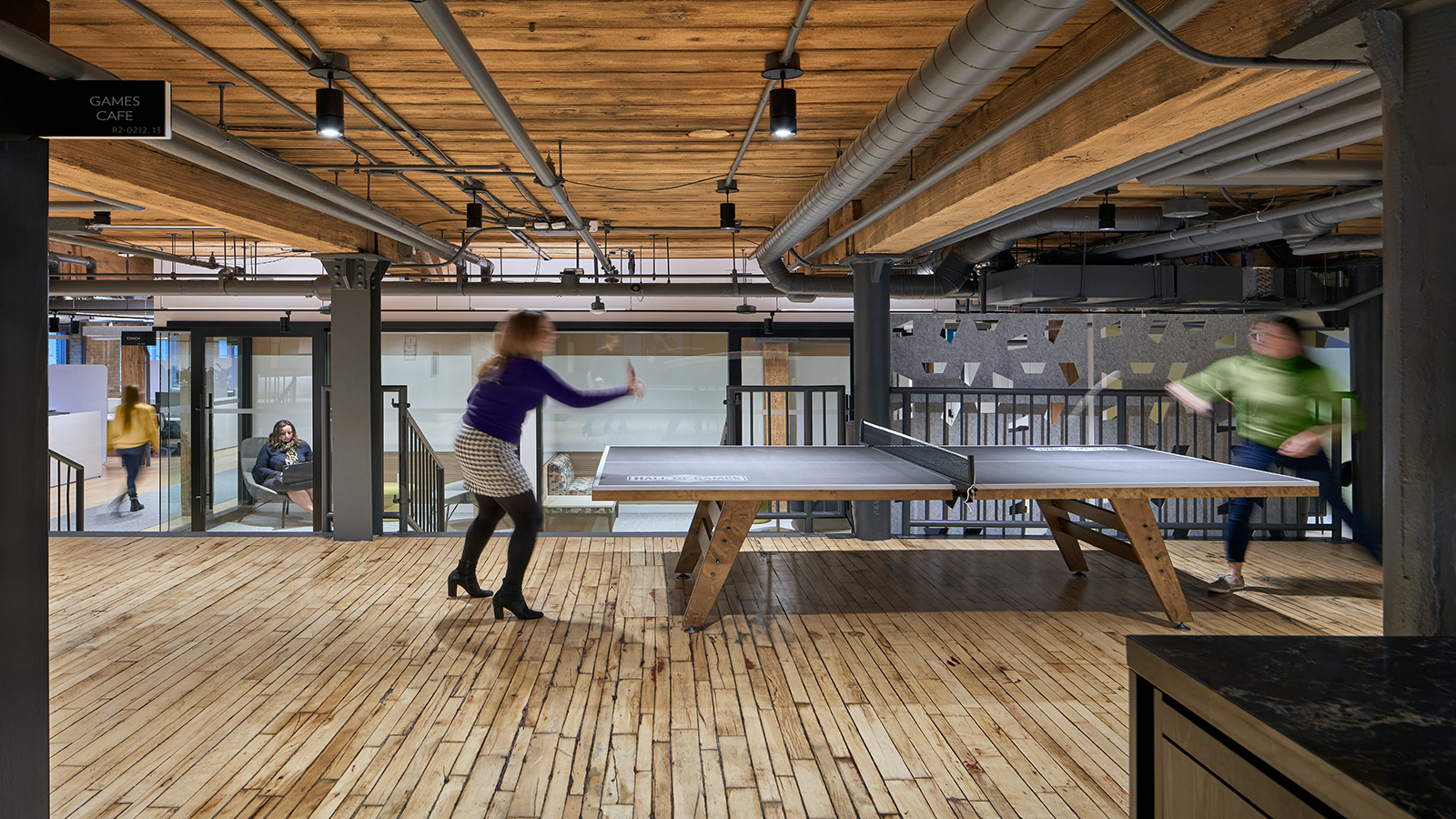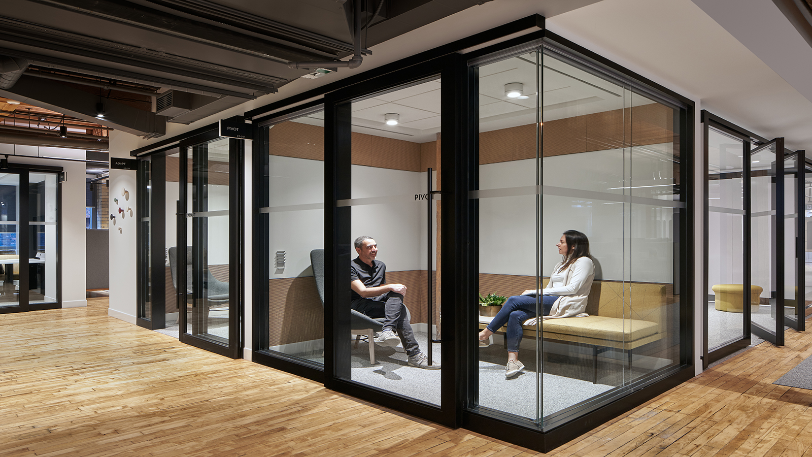 Transparency, achieved by wrapping the main circulation path around centralized glass-enclosed meeting spaces, lets teams see their peers and allows natural light to flood the floor. A series of enclosed and distinct collaboration settings, flexible to accommodate large or small groups and equipped with technology, support relaxed or formal interactions. Sensors measure space utilization to fine-tune meeting-room usage going forward.