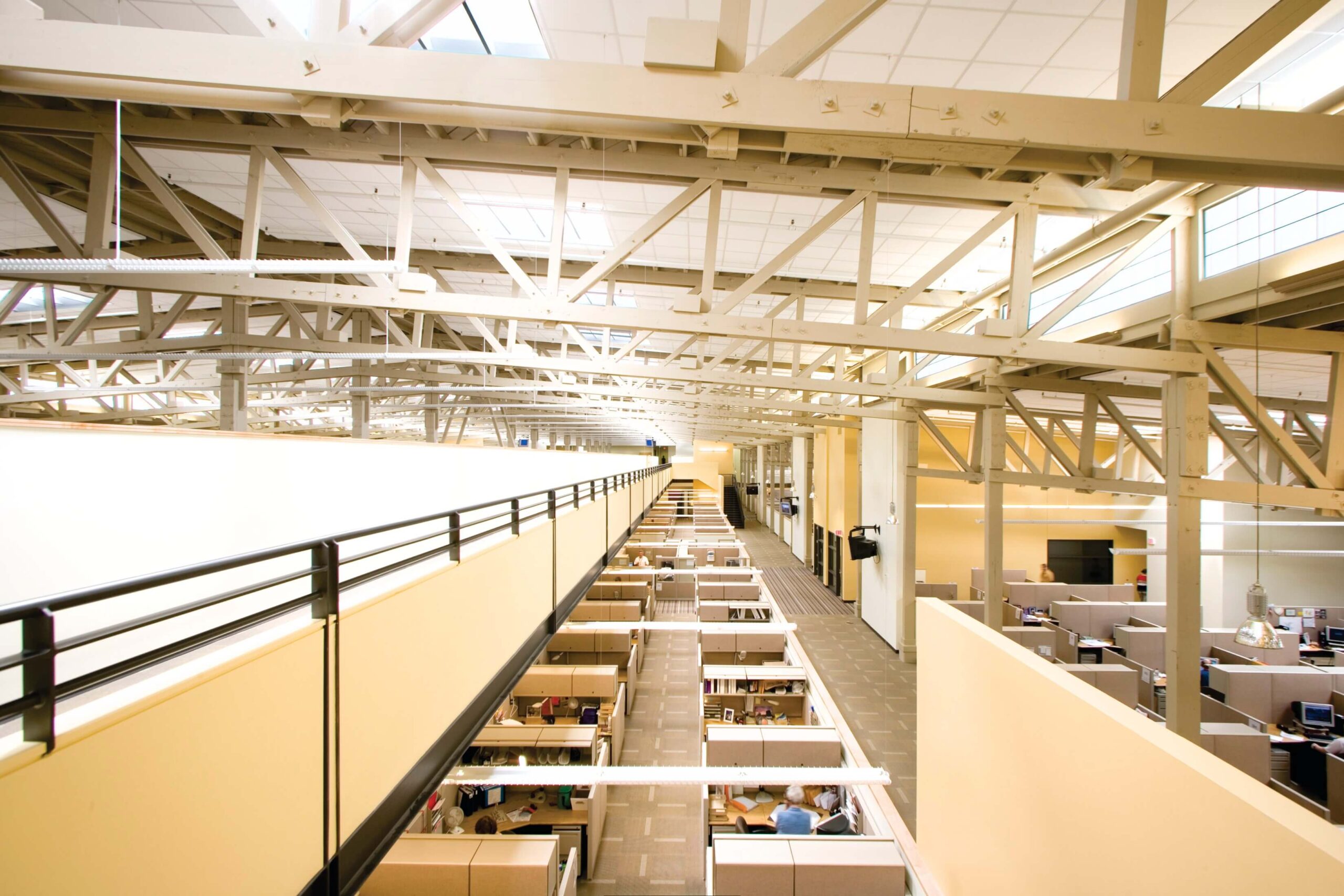 IA designed a modification of the existing structure to add a mezzanine, thereby reducing the cost of the renovation of the 40,000 square-foot core and shell space. This solution also facilitated a more dynamic interior space, shortened travel distances, and reduced interior construction, HVAC life cycle, and technology costs.