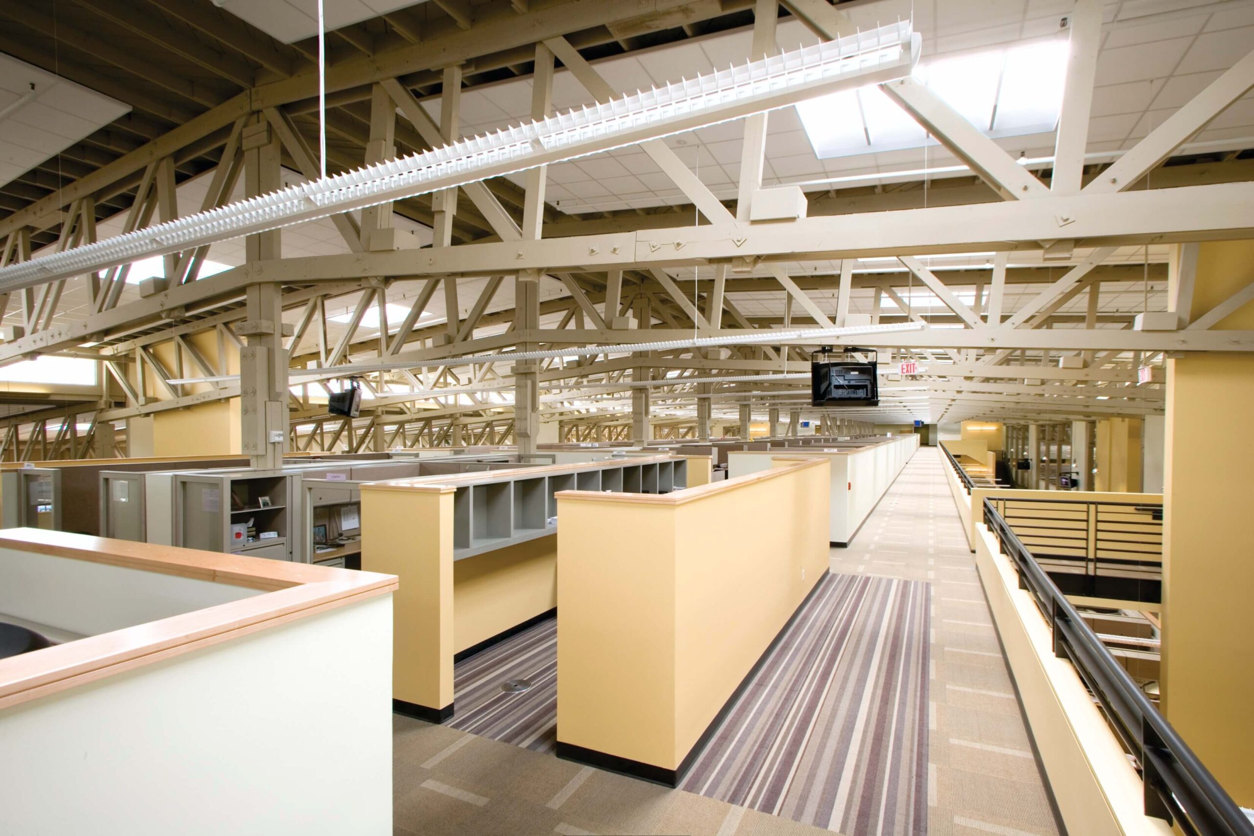 The completed call center houses more than 725 staff in a state-of-the-art facility. A key objective was to design a LEED certified level project by incorporating lighting ventilation, technology, and bio-waste technology to update and express the timber frame structure in a contemporary fashion. This goal was exceeded when the facility earned Silver under the LEED-NC v2.0 rating system.
