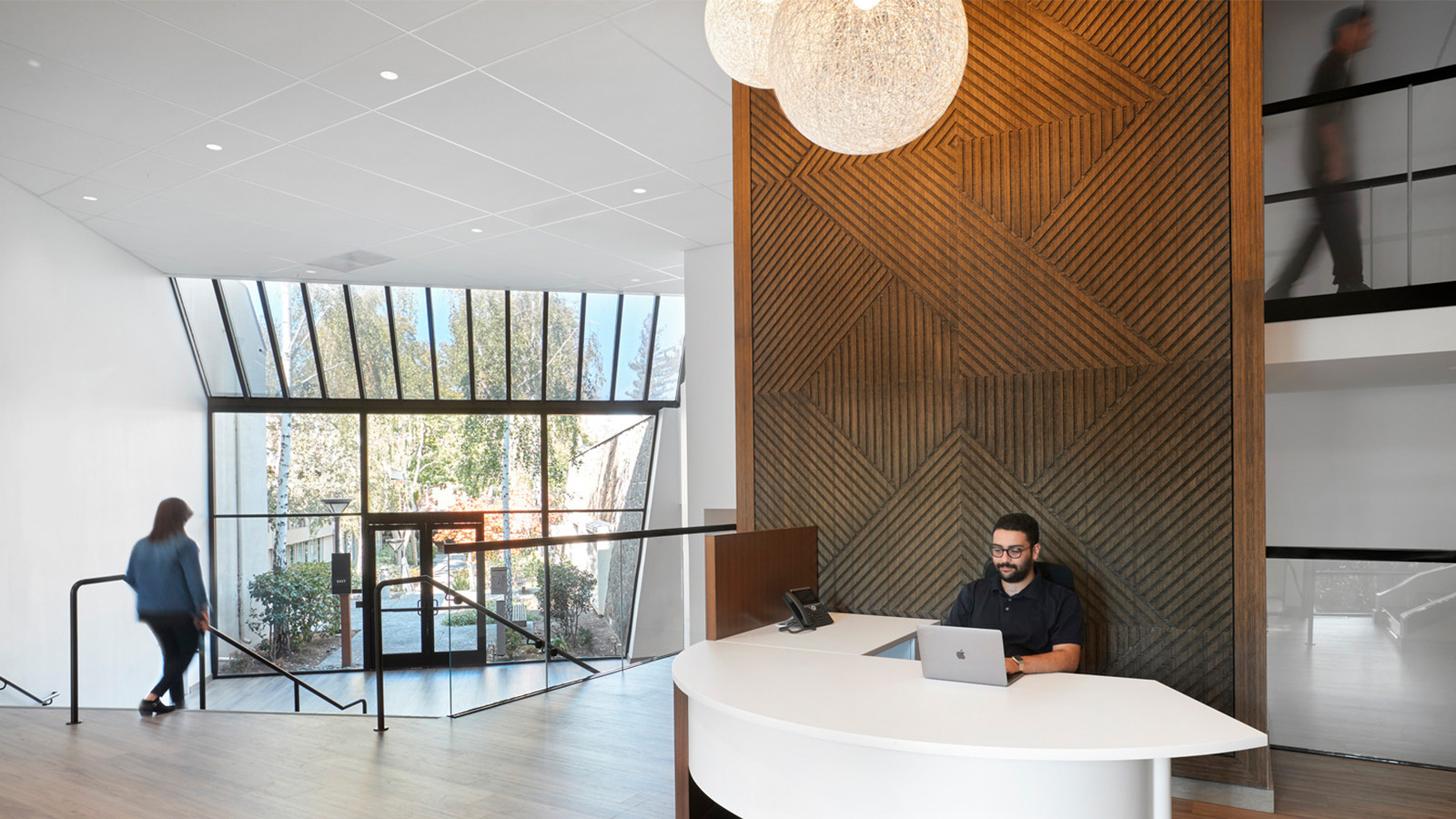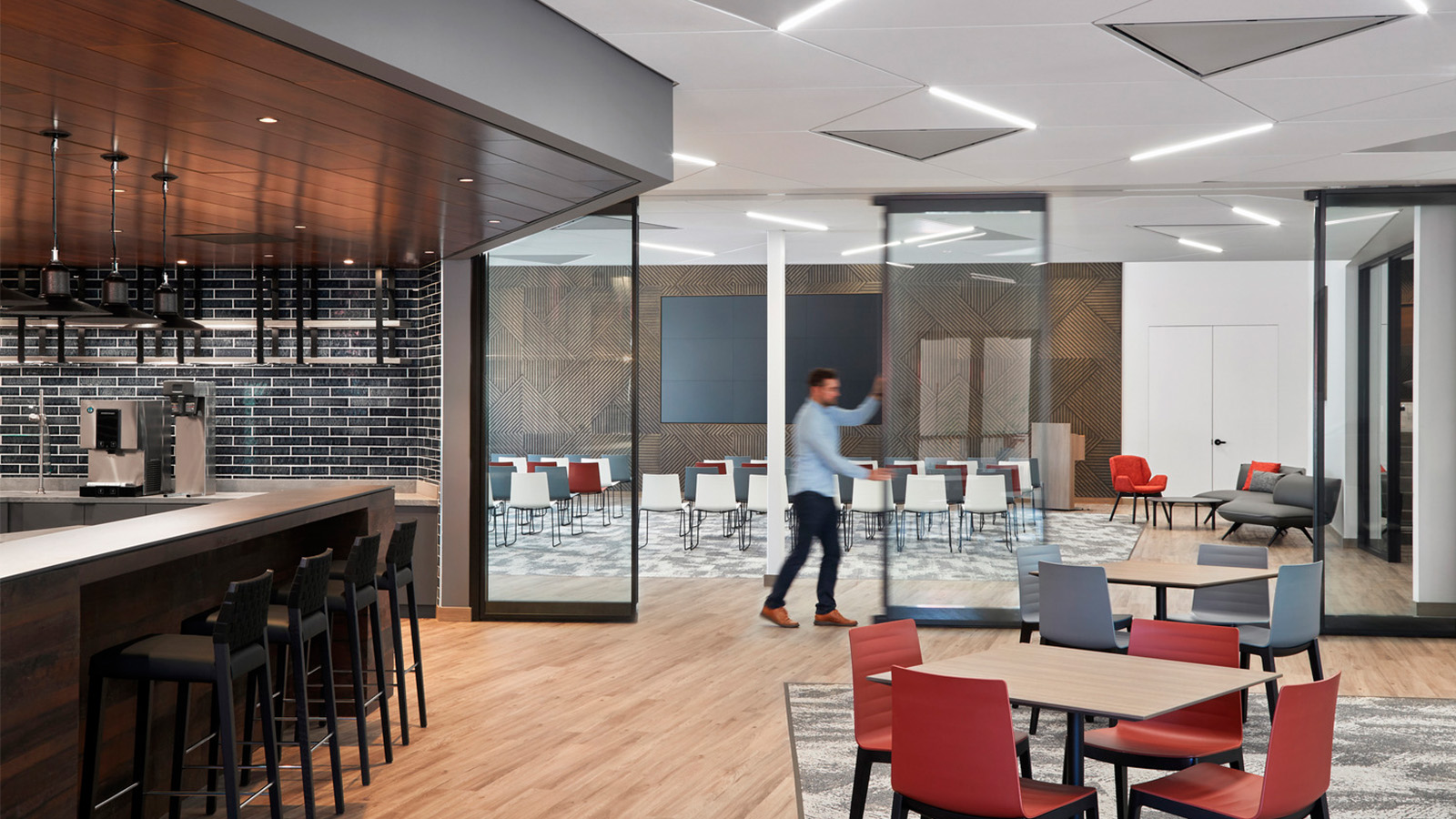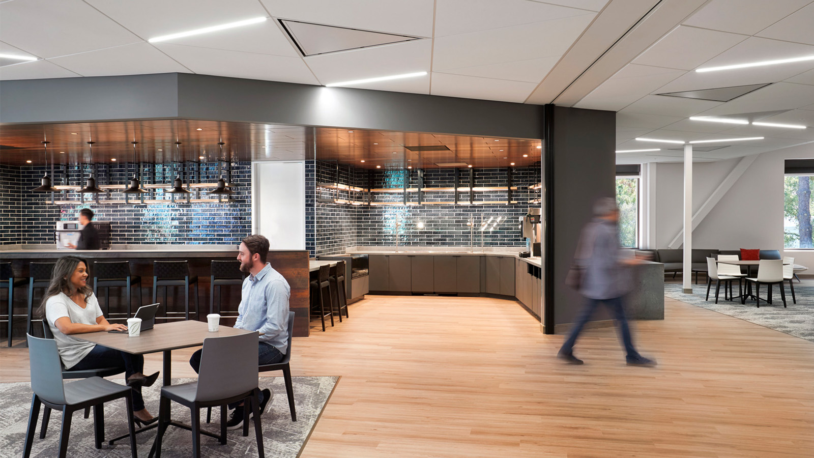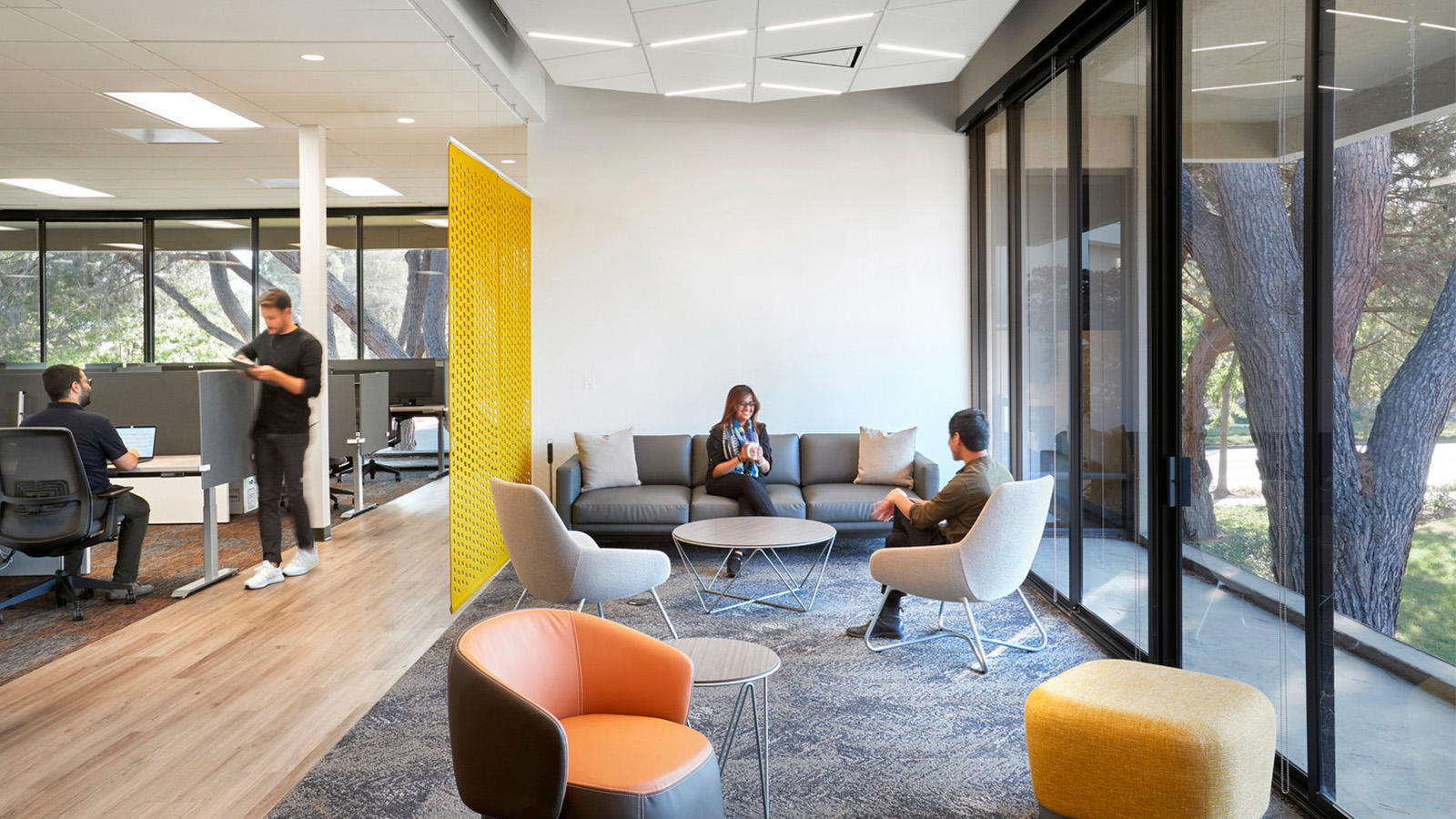 A refreshed and upgraded lobby makes a strong first impression at the start of the user journey. Moving into the space, each wing is differentiated by a signature color carried throughout the finishes and materiality, as well as custom signage and wayfinding. These neighborhoods have flexible, open collaboration areas that allow for future growth.