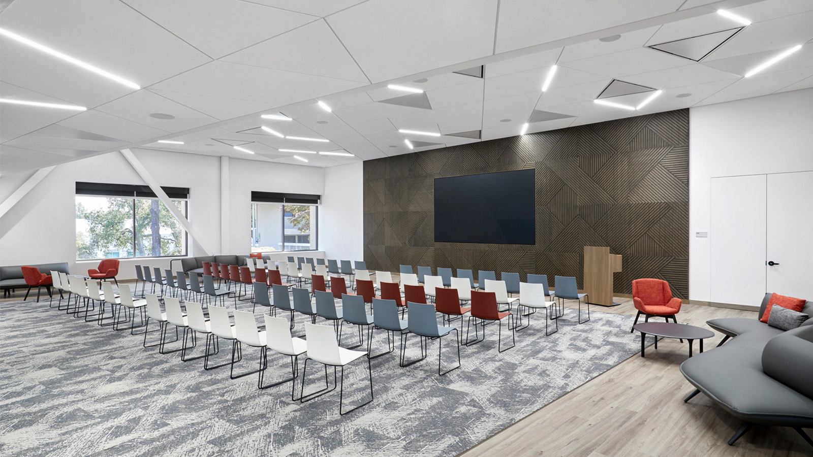 At the heart of the design is a large gathering space for town halls and seminars. A café and pub create a communal and social hub. The result is an experience that speaks to the culture and creativity of the users.