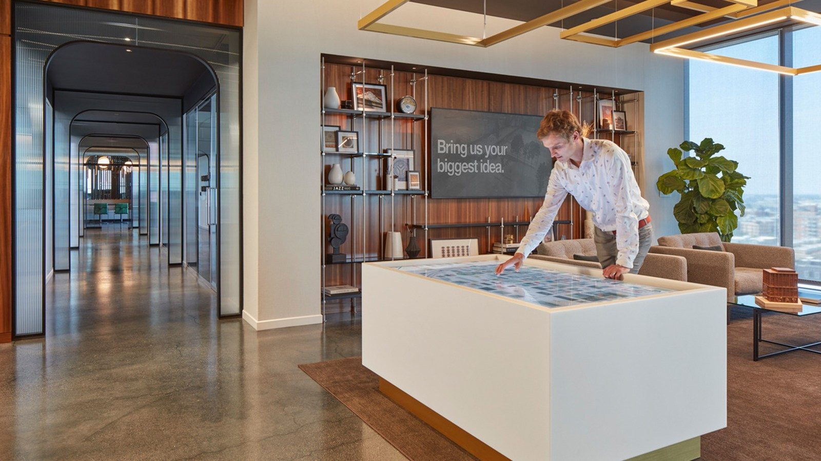 - Integrated digital displays throughout including a table-top embedded touchscreen with real-time project tracking