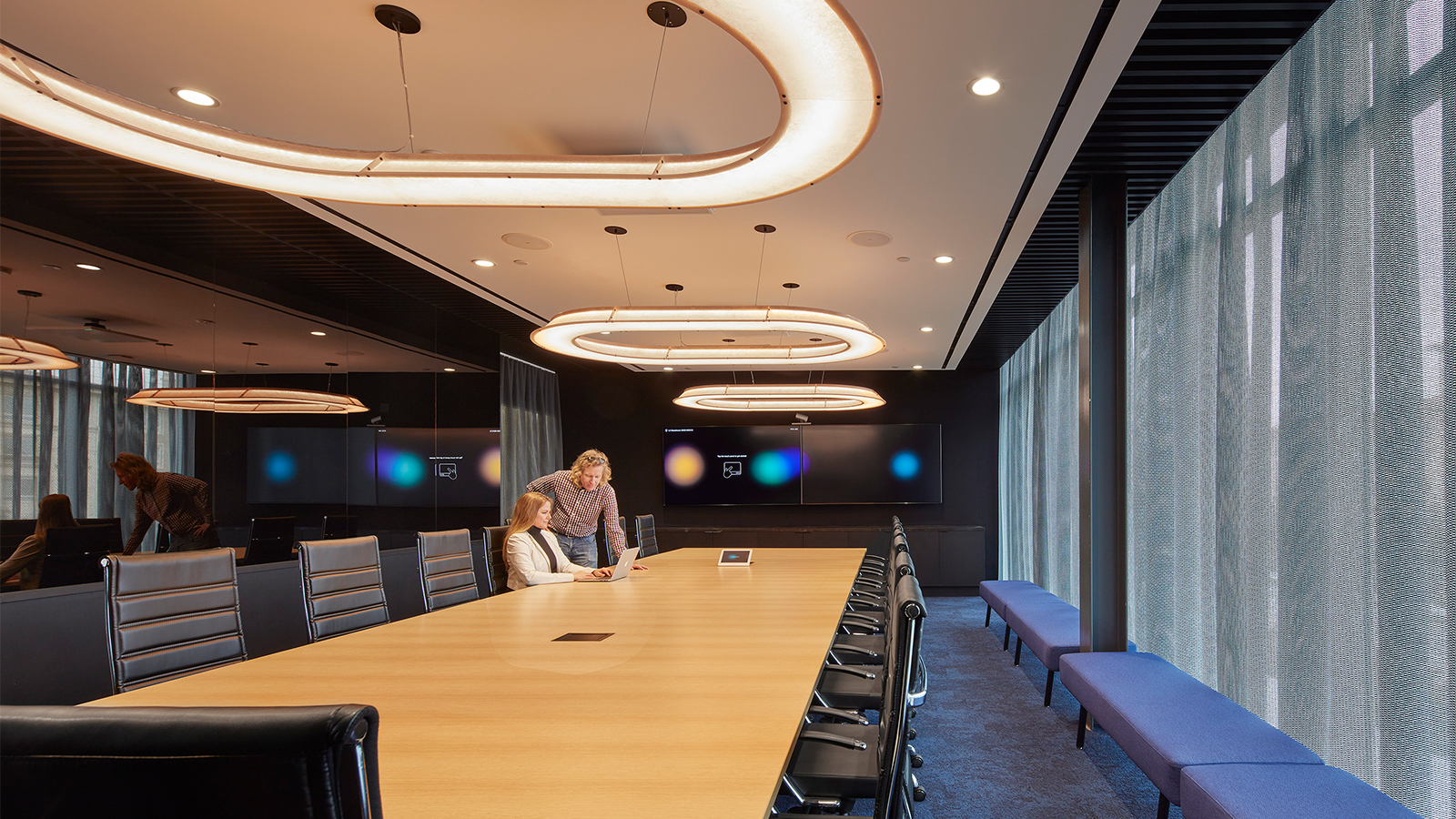 From visioning sessions with user groups to multiple test fits, extensive planning preceded IA’s design of the new workplace to ensure an inspiring environment. At the double-height lobby, a two-story wall of dichroic glass creates a shifting and unpredictable display of color, an intriguing design feature, enhanced by a 20-foot video screen on an adjacent wall. A custom white neon light fixture suspended from the ceiling spells out Tencent.