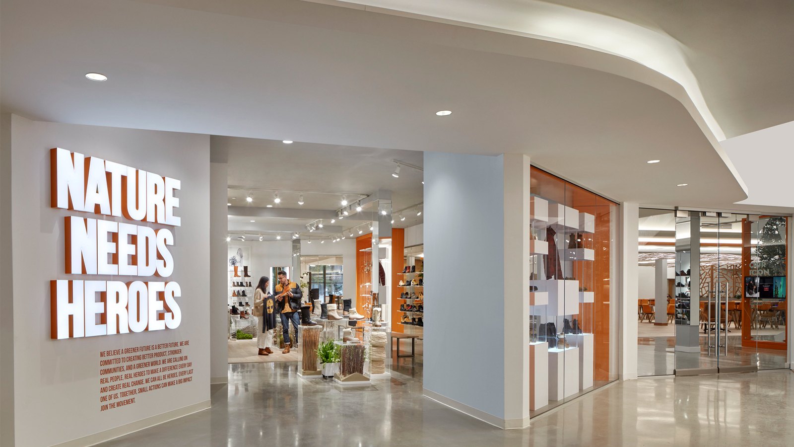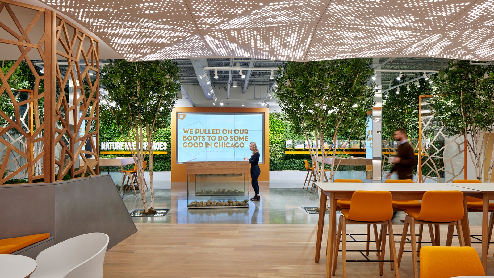 - Architectural language throughout takes cues from Timberland’s new retail design with reflective materials, organic forms, and textured layers