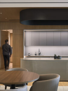 The café area, featuring a stunning marble island and sleek concealed cabinetry, creates a venue that encourages the Trivest team to take a break and socialize. The design incorporates the terrace that offers a variety of relaxed seating options for casual meetings, work, socializing, or entertaining.