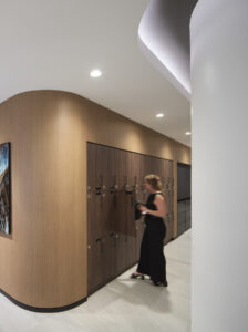 White walls and wood slats at the ceiling add detail and polish throughout, IA-designed deep cove lighting accents ceiling curves and creates high-end feel, and pendant lights and white-washed-wood wall coverings bring warmth to private offices. Brushed brass lockers for staff ensure the clean lines and airiness of the workplace settings remain open and are another example of the fine attention to detail and extraordinary finishes.