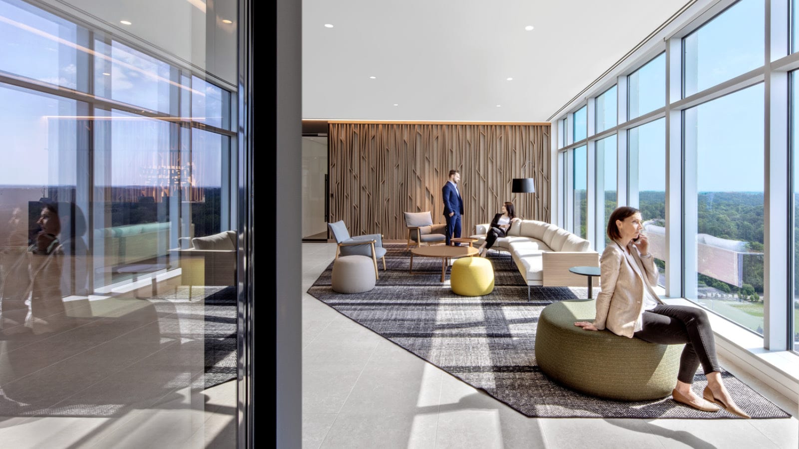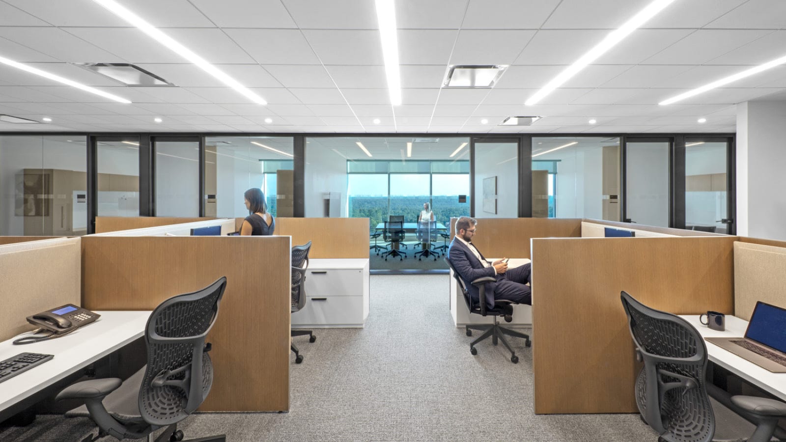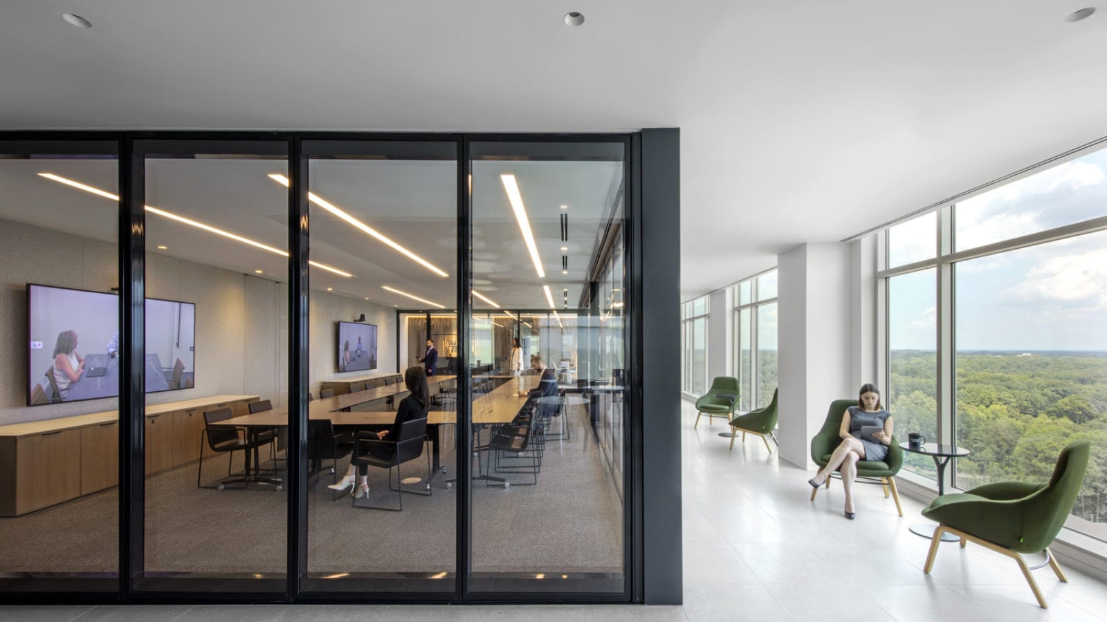 - Glass-walled, universally-sized attorney offices with workstations in an open office area
