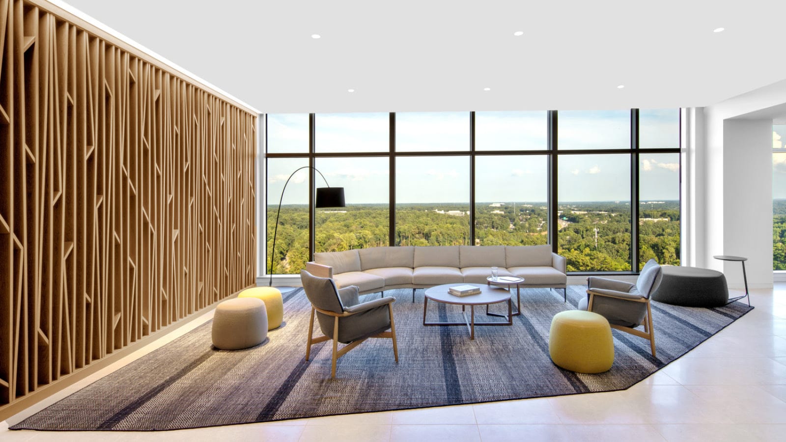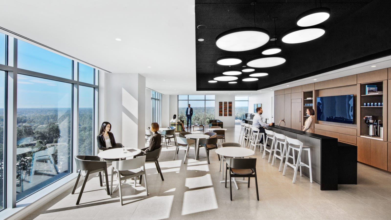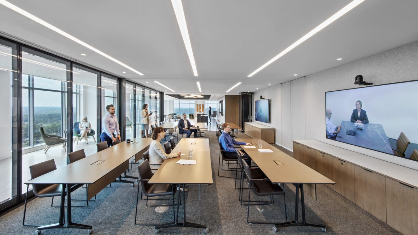 - Glass-walled, universally-sized attorney offices with workstations in an open office area