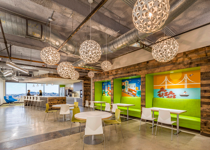 Bold environmental graphics, bright lighting, and ample seating round out the kitchen zone of Rocket Fuel in San Francisco. Unobstructed views of City Hall and the South of Market (SoMa) district of the city are maximized by strategically located seating areas along the high-top island.