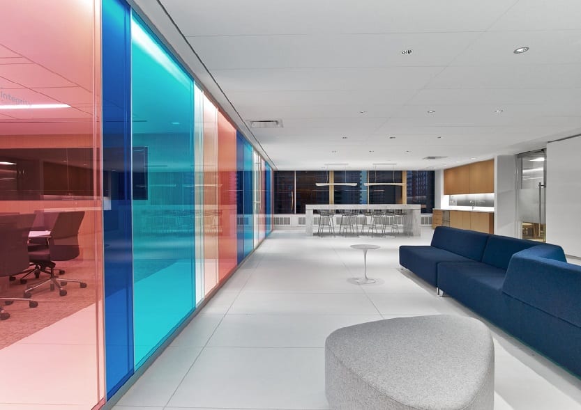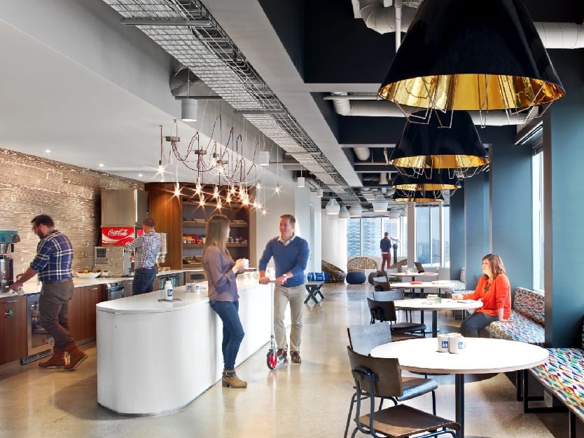 In the Toronto office of LinkedIna kitchenette fronts a glazed wall overlooking the cityscapeLocated along a primary circulation route and surrounded by numerous seating options, the kitchen area can be utilized for meals, meetings, or down time.