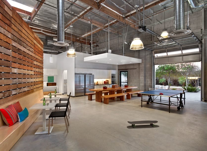 The kitchen anchors an area of the floorplan designated for socialization in the Santa Monica office of SapientNitro. Taking advantage of the Southern California climate, the interior extends out onto an outdoor patio area.