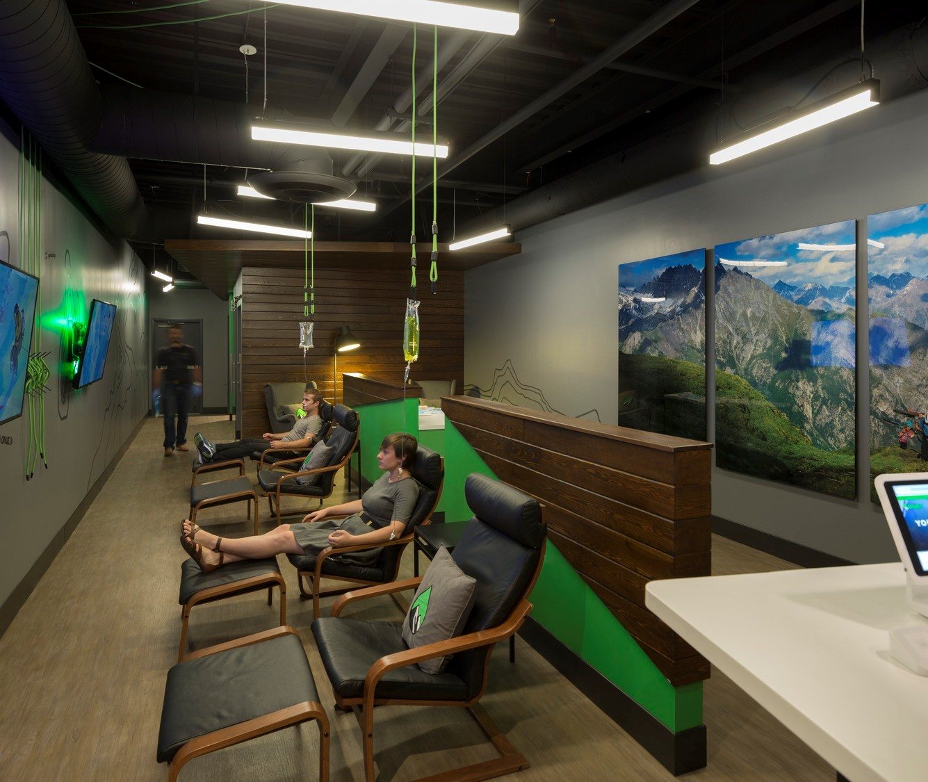 Need serious hydration, something bottled water can’t provide? ONUS IV Hydration Treatment Clinic in Denver, CO, is just the ticket for rehydrating with essential minerals and electrolytes or to address a specific condition like flu, headache, jetlag, hangover, or something more serious. As the company's first-ever stand-alone clinic, this project delivers a relaxing environment and sets the design aesthetic and palette (neutral earth tones and the brand’s shade of electric green) for future locations.