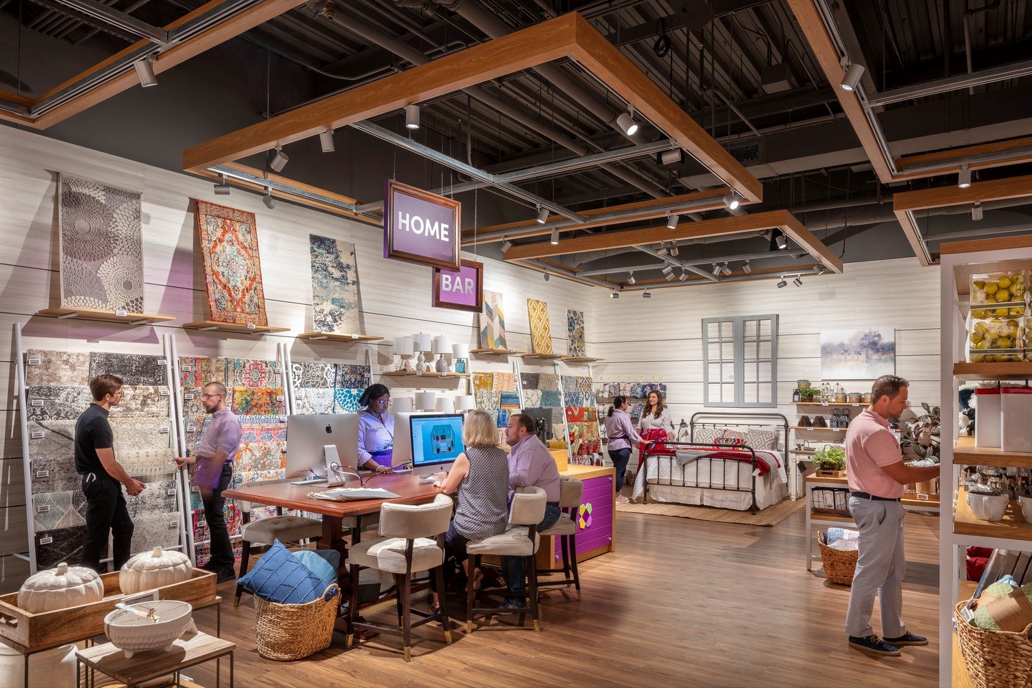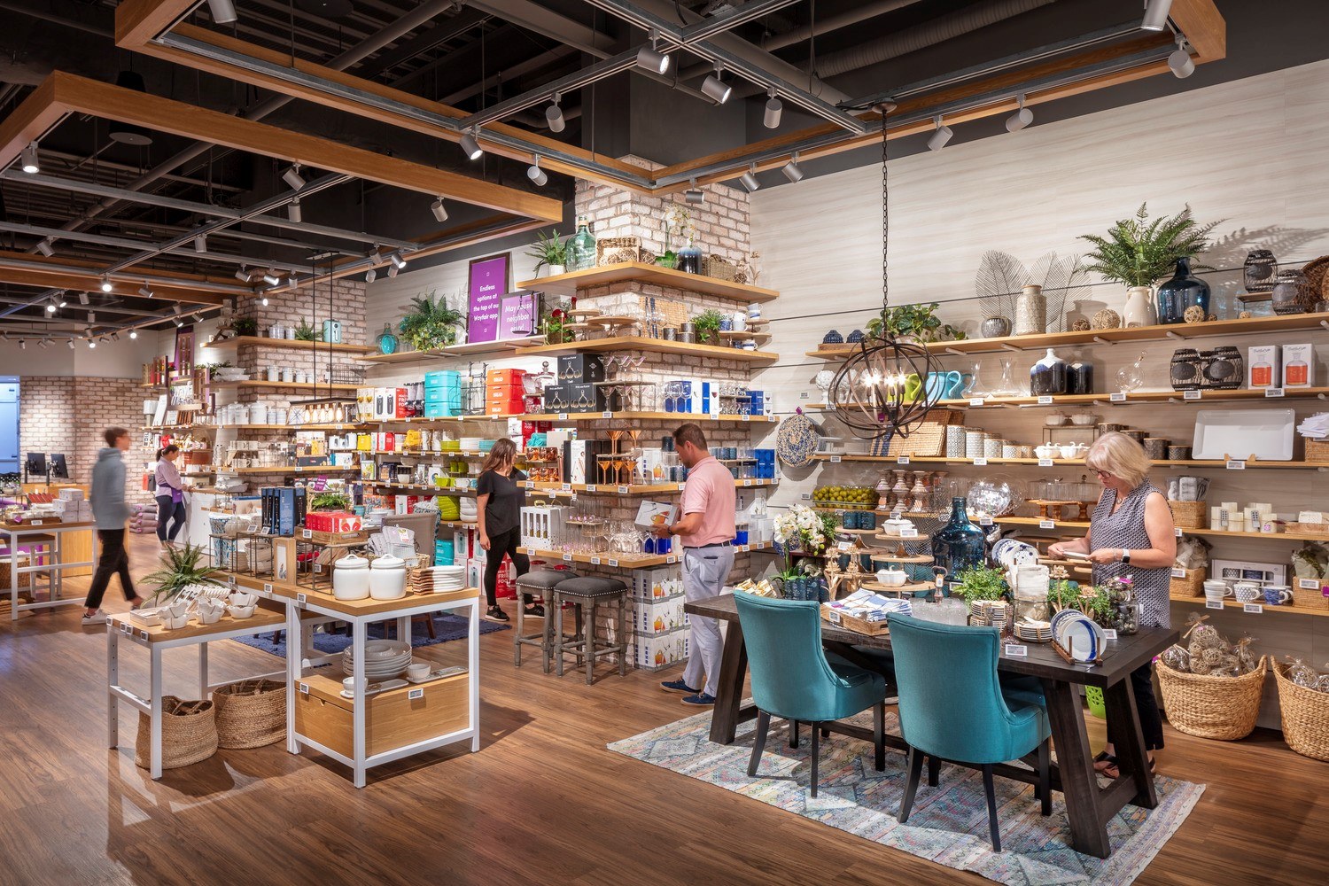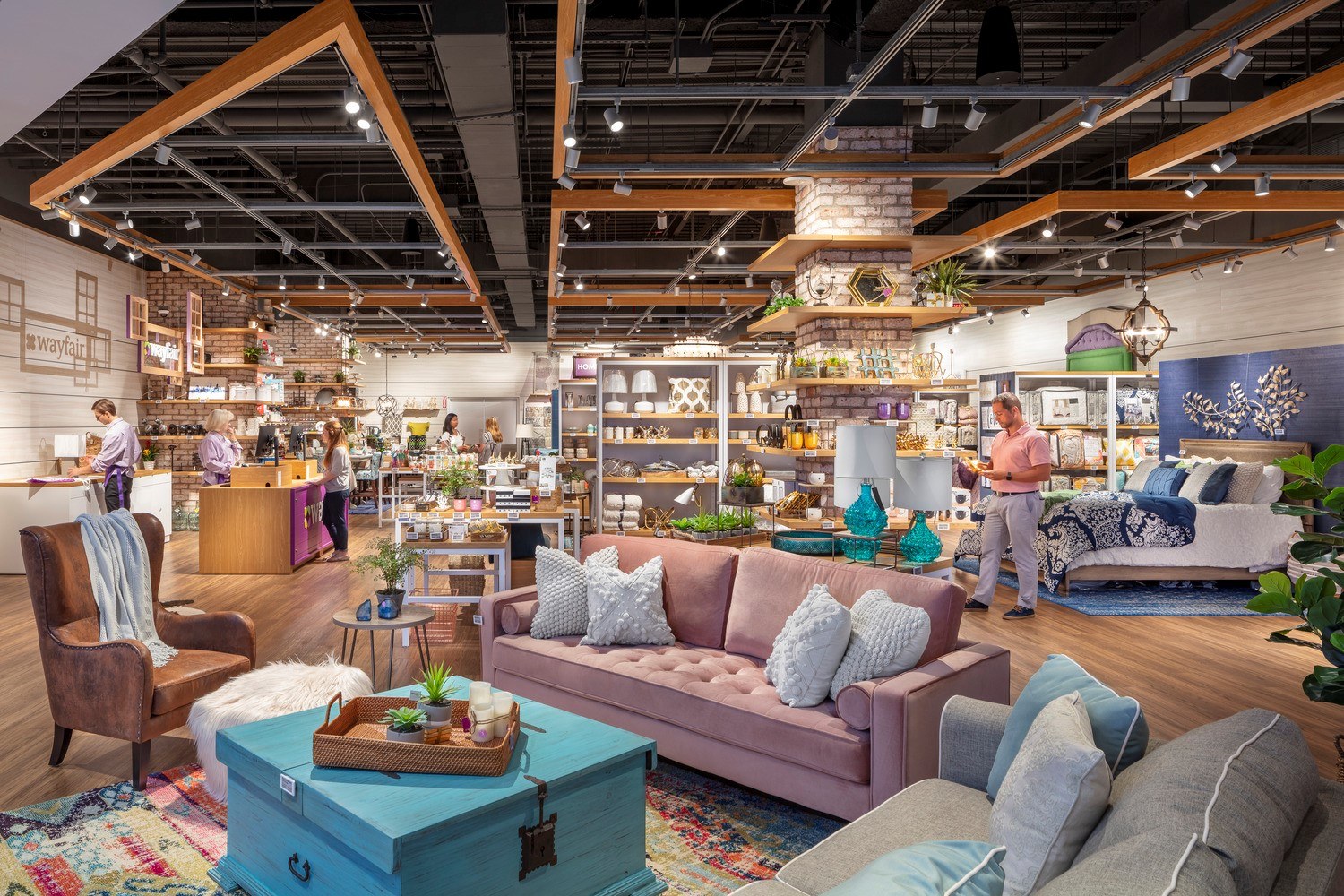 Here shoppers can browse, make purchases, or place orders for home delivery with the advantage of design advice from on-site Wayfair consultants. Exposed brick and custom millwork add a welcoming warmth.
