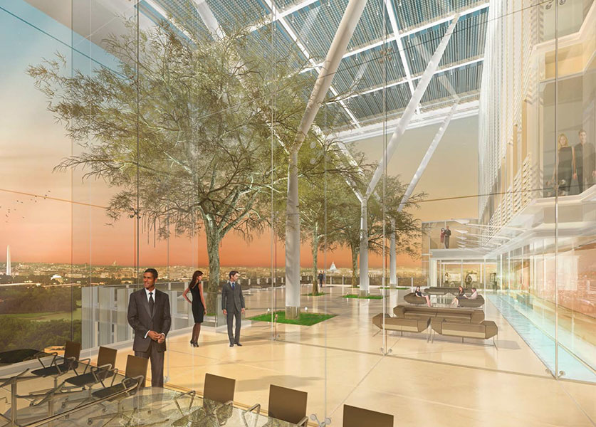 Floor plates are also laid as a diagrid, providing structural stability while allowing for ventilation through a light-filled atria. Workspaces in atriums hits the sweet spot for both developers and occupants: Natural light and ventilation supports healthy work environments, while concentrated space allocation maximizes square footage.